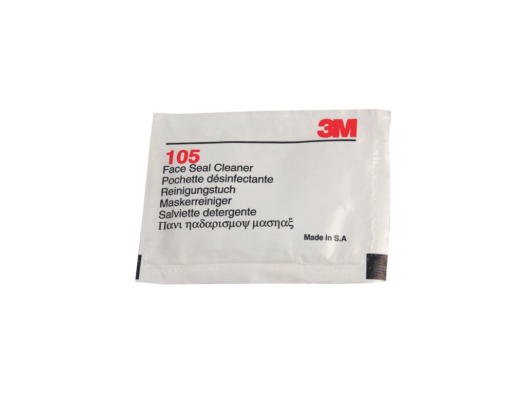 3M™ 105 čistící sada na obličejová těsnění masek se dodává ve formě jednotlivě balených zvlhčených ubrousků a je určen k čištění obličejové části bez jejího poškození