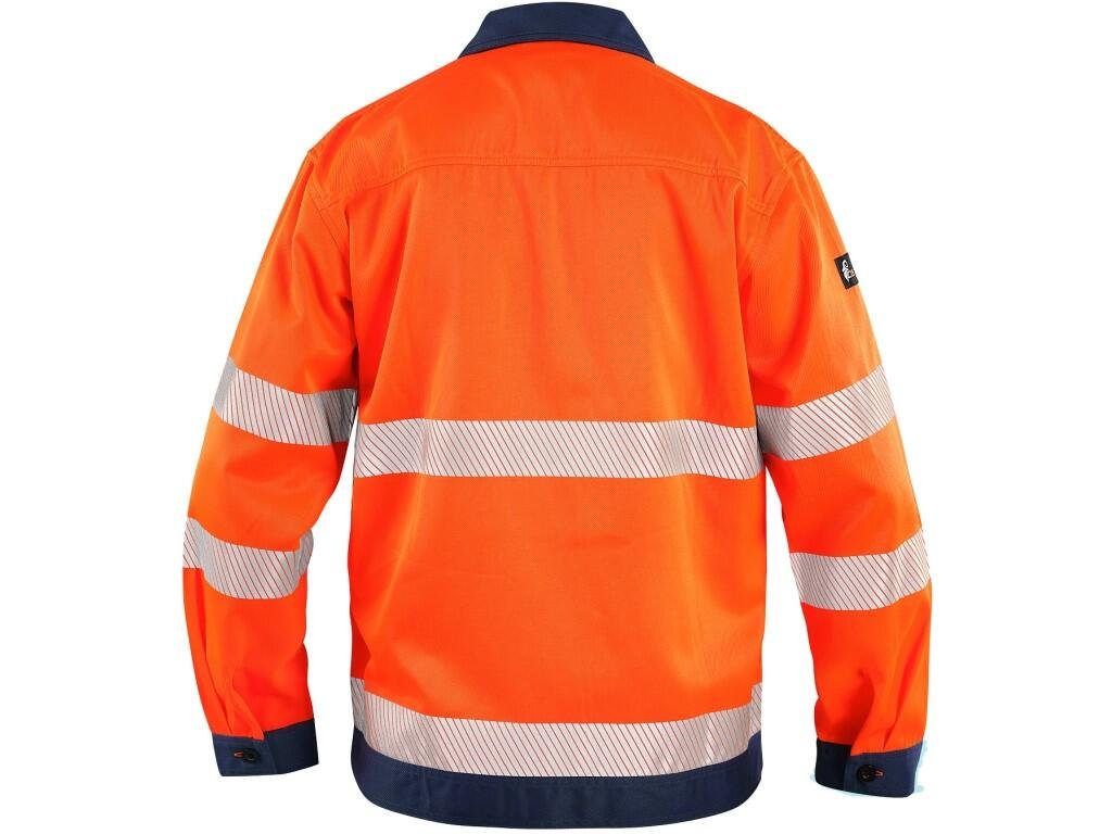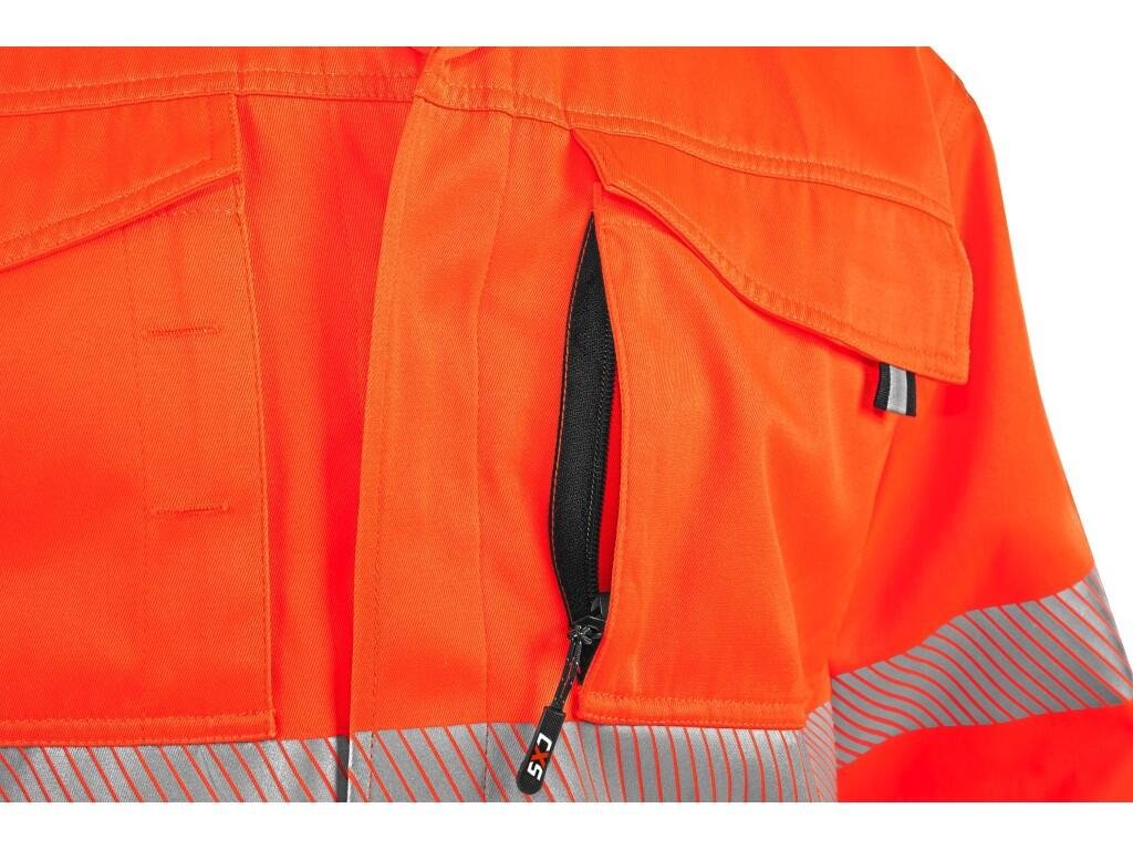 Pánská výstražná blůza se segmentovanými reflexními pásky (šířka 5 cm). Pevná keprová vazba zajišťuje pevnost a odolnost materiálu. Blůza je vybavena krytým zapínáním na plastové knoflíky, náprsními kapsami s klopou na suchý zip – levá se skrytou kapsou na zip, pravá s menší kapsou na tužku a bočními kapsami. Manžety rukávů jsou zapínány na plastový knoflík. Doporučené použití: stavebnictví, silničáři, řidiči, údržba, logistika, letecká a lodní doprava, popeláři, záchranáři.