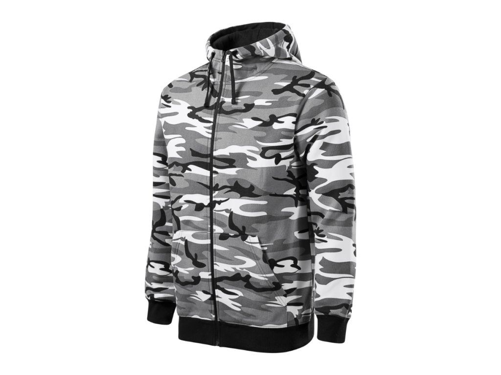 rovný střih s bočními švy, celopropínací reverzní spirálový zip, kapuce s podšívkou, na stažení šňůrkou, vnitřní část průkrčníku začištěna páskou, nakládané kapsy ve stylu klokanky, dolní lem a manžety rukávů z žebrového úpletu 2:2 s 5 % elastanu, kontrastní prvky, vnitřní strana počesaná