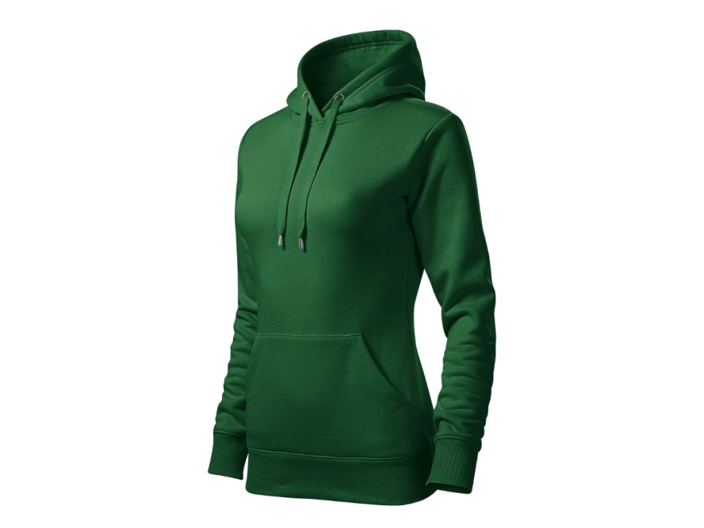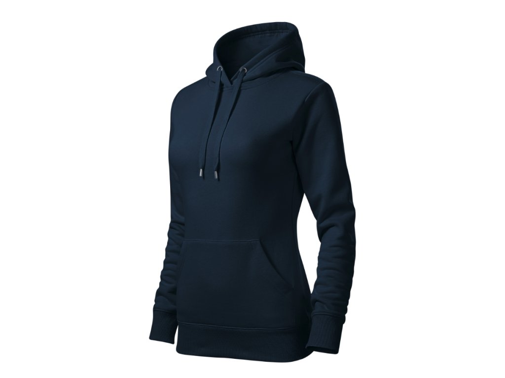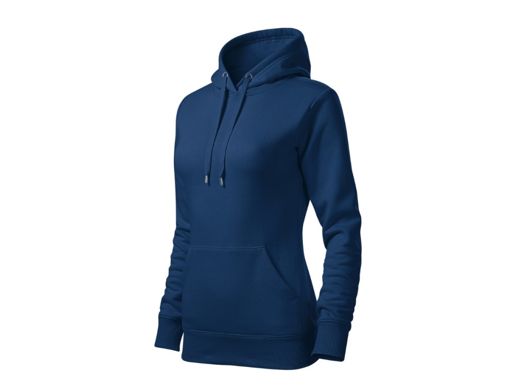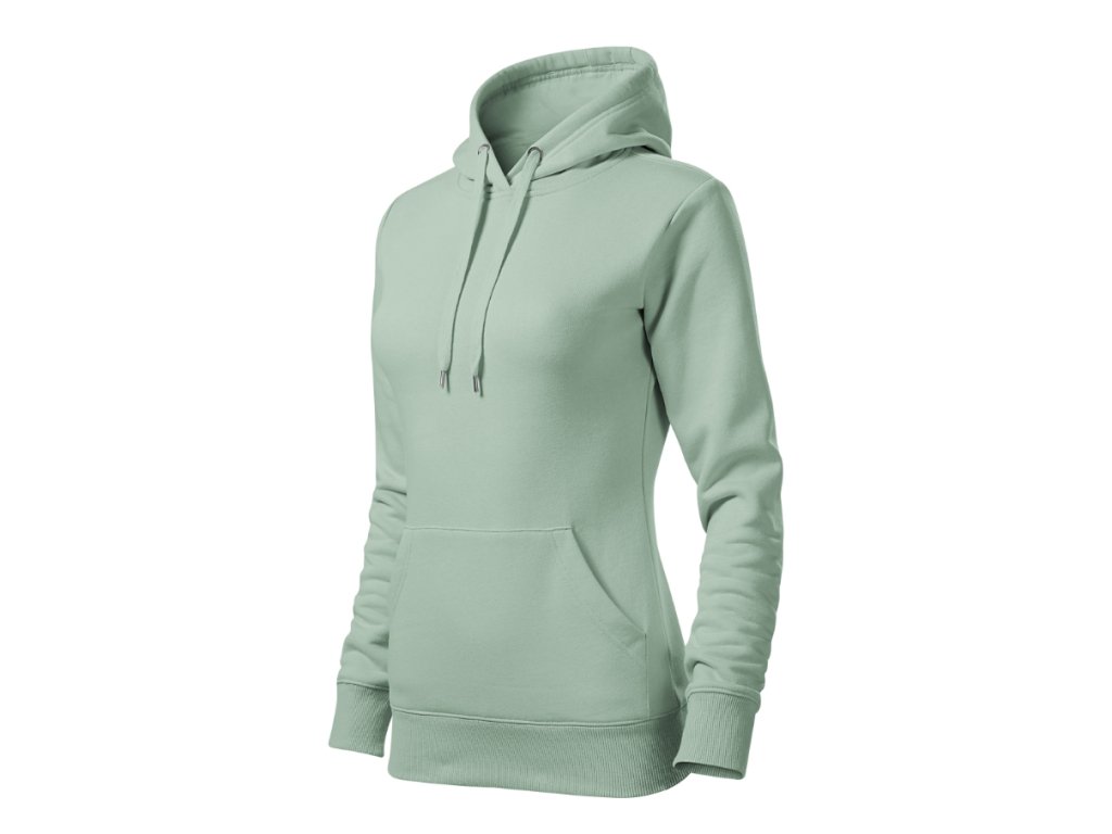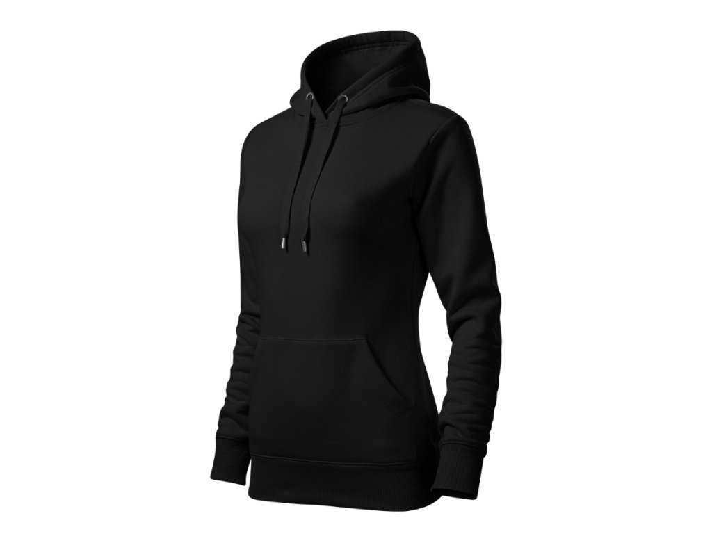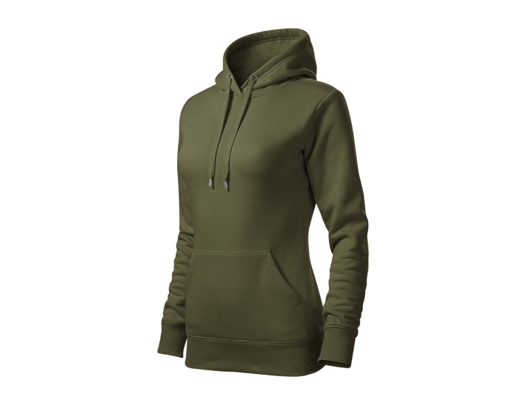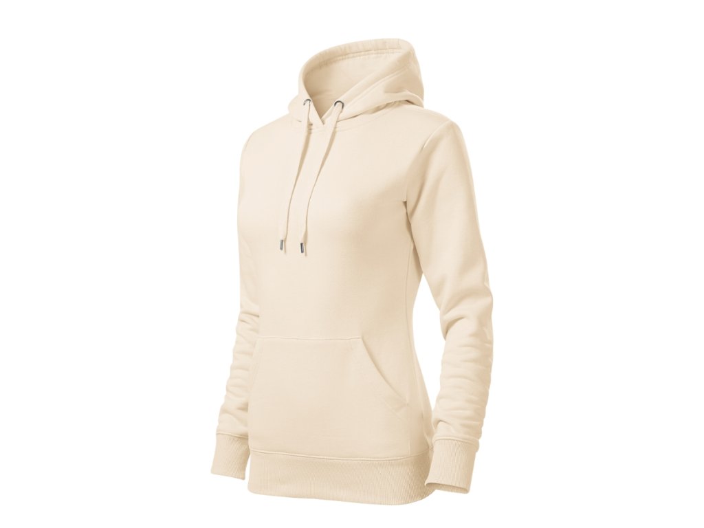 lehce vypasovaný střih s bočními švy, kapuce s podšívkou, na stažení šňůrkou, vnitřní část průkrčníku začištěna páskou v barvě vrchového materiálu, nakládaná kapsa ve stylu klokanky, dolní lem a manžety rukávů z žebrového úpletu 2:2 s 5 % elastanu, vnitřní strana počesaná