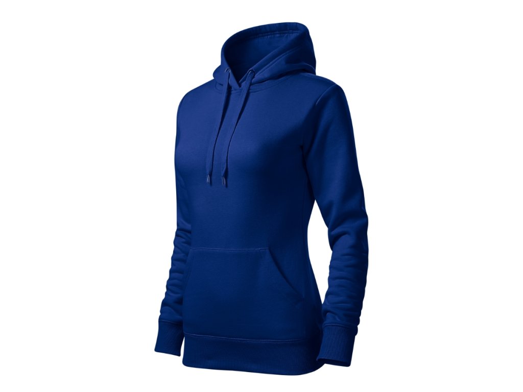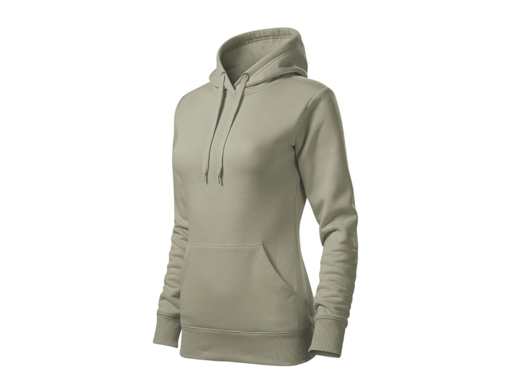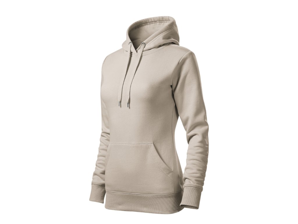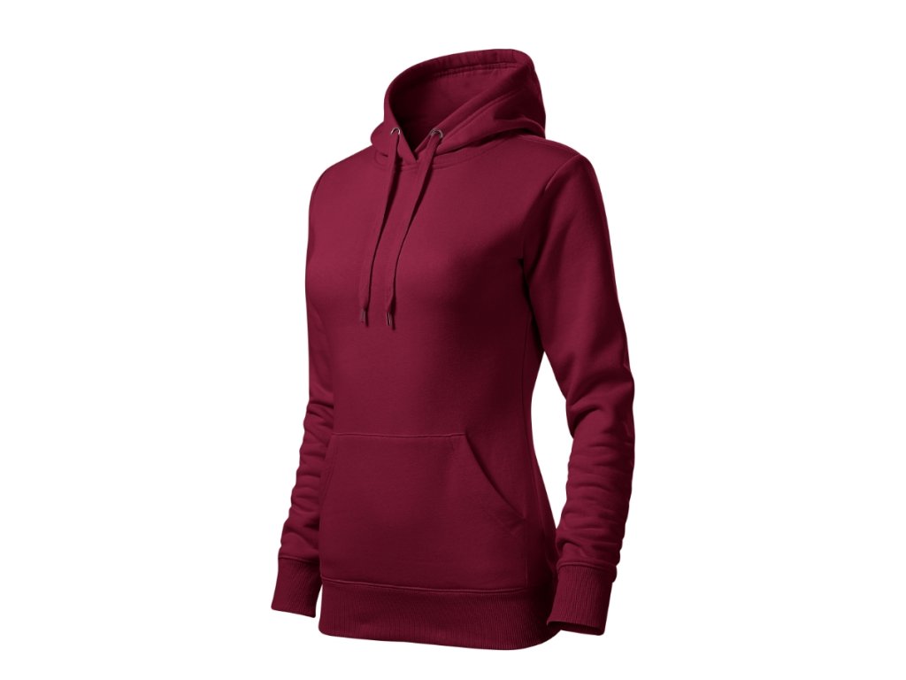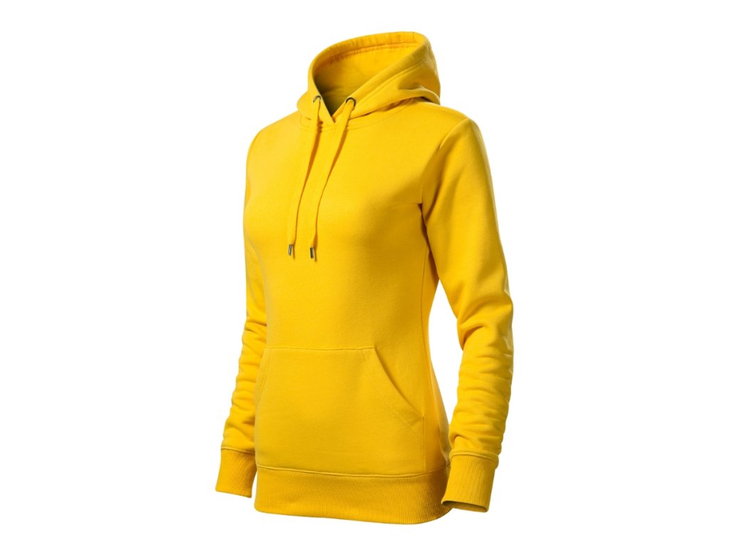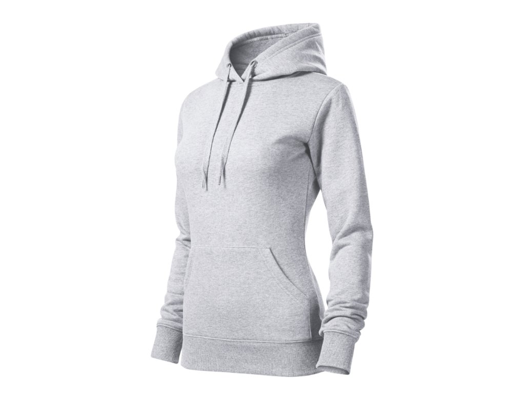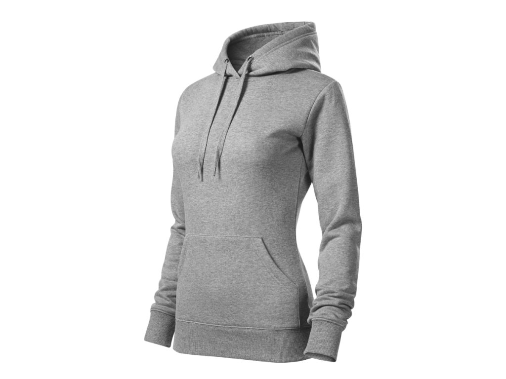 lehce vypasovaný střih s bočními švy, kapuce s podšívkou, na stažení šňůrkou, vnitřní část průkrčníku začištěna páskou v barvě vrchového materiálu, nakládaná kapsa ve stylu klokanky, dolní lem a manžety rukávů z žebrového úpletu 2:2 s 5 % elastanu, vnitřní strana počesaná