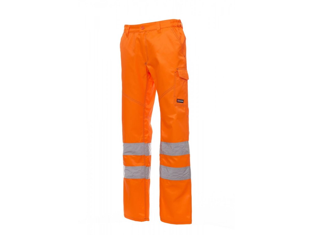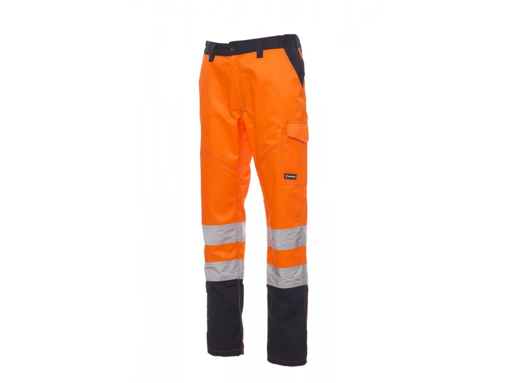 Pánské kalhoty, celoroční, s vysokou viditelností s reflexními pruhy, elastické pásky na bocích a poutka v pase, zapínání na plastový zip a na knoflík, dvě přední kapsy klasického střihu, jedna postranní kapsa LOCK SYSTEM, jedna kapsa na svinovací metr, dvě zadní kapsy, z nichž jedna otevřená a druhá s klopou na suchý zip. Kontrastní prošití, v rozkroku a na vnitřní straně nohavice s trojjehlovým prošitím.