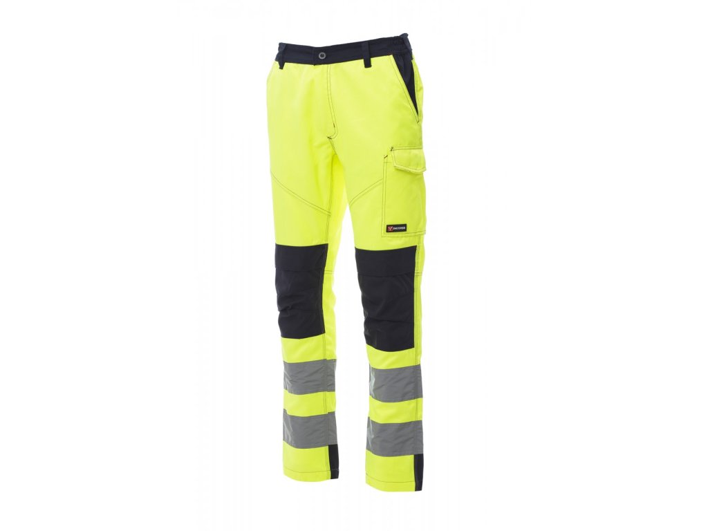 Pánské kalhoty s chrániči kolen, celoroční, s vysokou viditelností s reflexními pruhy, elastické pásky na bocích a poutka v pase, zapínání na plastový zip a na knoflík, dvě přední kapsy klasického střihu, jedna postranní kapsa LOCK SYSTEM, jedna kapsa na svinovací metr, kapsa na smartphone, dvě zadní kapsy, z nichž jedna otevřená a s reflexními páskami a druhá s klopou na suchý zip. Kontrastní prošití, v rozkroku a na vnitřní straně nohavice trojjehlové prošití.