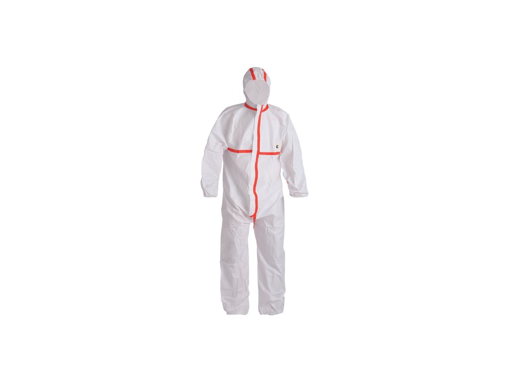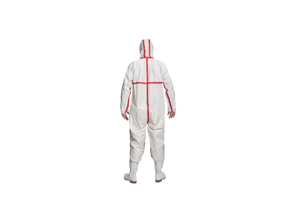 • ochranná antistatická jednorázová kombinéza s kapucí, vhodná pro ochranu proti nebezpečným mirkoorganizmům • mikroporézní paropropustnou vrstvou, přelepenými švy, samolepící klopou na zip a gumičkou stahovatelnými rukávy a nohavicemi • je odolná řadě chemikálií • v ochraně proti postřiku kapalnými chemikáliemi patří do kategorie CE III • v ochraně proti kapalným aerosolům kategorie typu 4B • v ochraně proti průniku pevných částic a ochraně proti aerosolům typu 5B • v ochraně proti postřiku kapalnými chemikáliemi typu 6B • v ochraně proti kontaminaci radioaktivními částicemi do kategorie Class 2