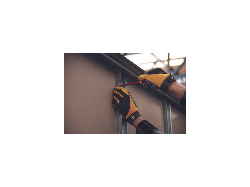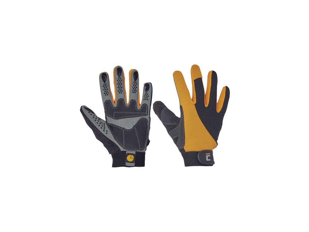 • rukavice šité ze syntetického materiálu s vlastnostmi jemné štípané usně • s protiskluzovými potisky na prstech • zesílenou úchopovou plochou v dlani • jemnou nylonovou tkaninou na bocích prstů zajišťující snadnou pohyblivost • nastavitelná manžeta na suchý zip