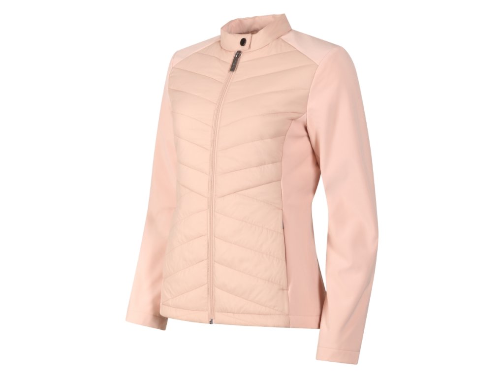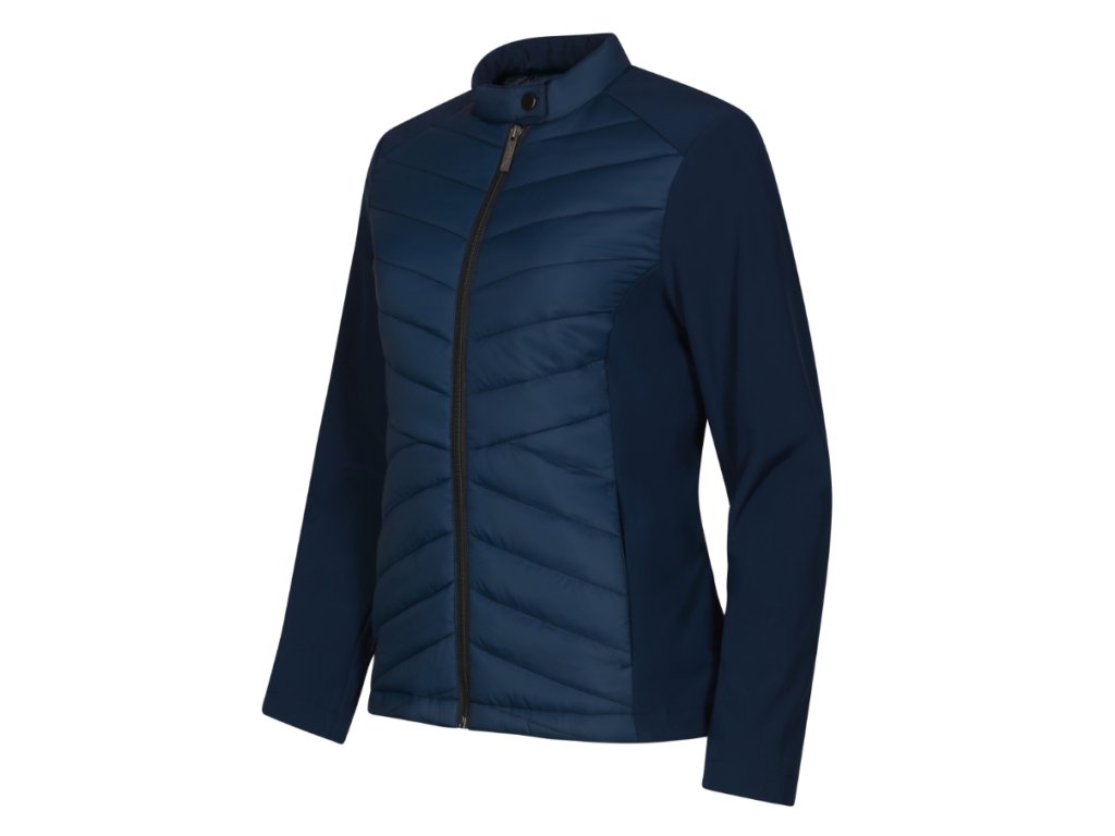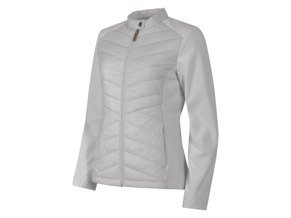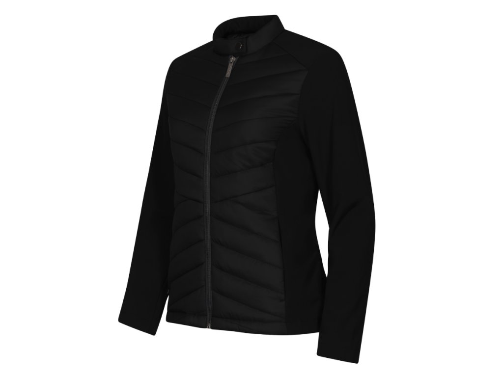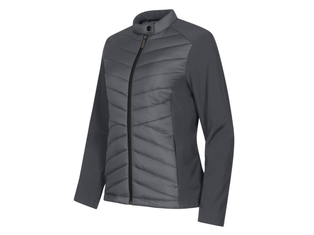 kombinace prošívaného a softshellového materiálu, střih tvarovaný bočními díly, stojáček na druk, celopropínací spirálový zip, boční kapsy se spirálovým zipem, vnitřní náprsní kapsa na zip, vstup pro branding v podšívce zadního dílu