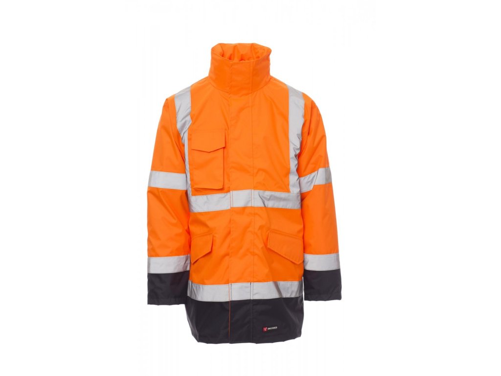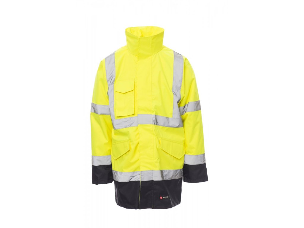 Parka dvoubarevná 4v1, vysoká viditelnost. Vnější bunda bez podšívky, zapínání na plastový zip s klopou na suchý zip, kapuce v límci, všívané rukávy. Dvě přední kapsy s klopou na suchý zip: pravá náprsní kapsa na suchý zip, uvnitř kapsička na mobilní telefon a závěsný kroužek pro pouzdro na jmenovku, vnitřní kapsa na suchý zip. Dva pruhy kolem hrudníku, nárameníků a rukávů. Tepelně podlepené švy. Odnímatelná vnitřní zateplená bunda s odnímatelnými rukávy, zapínání na plastový zip, žebrované manžety, dvě přední kapsy na zip, jedna vnitřní kapsa na zip, jeden pruh kolem hrudníku a dva svislé na náramenících.