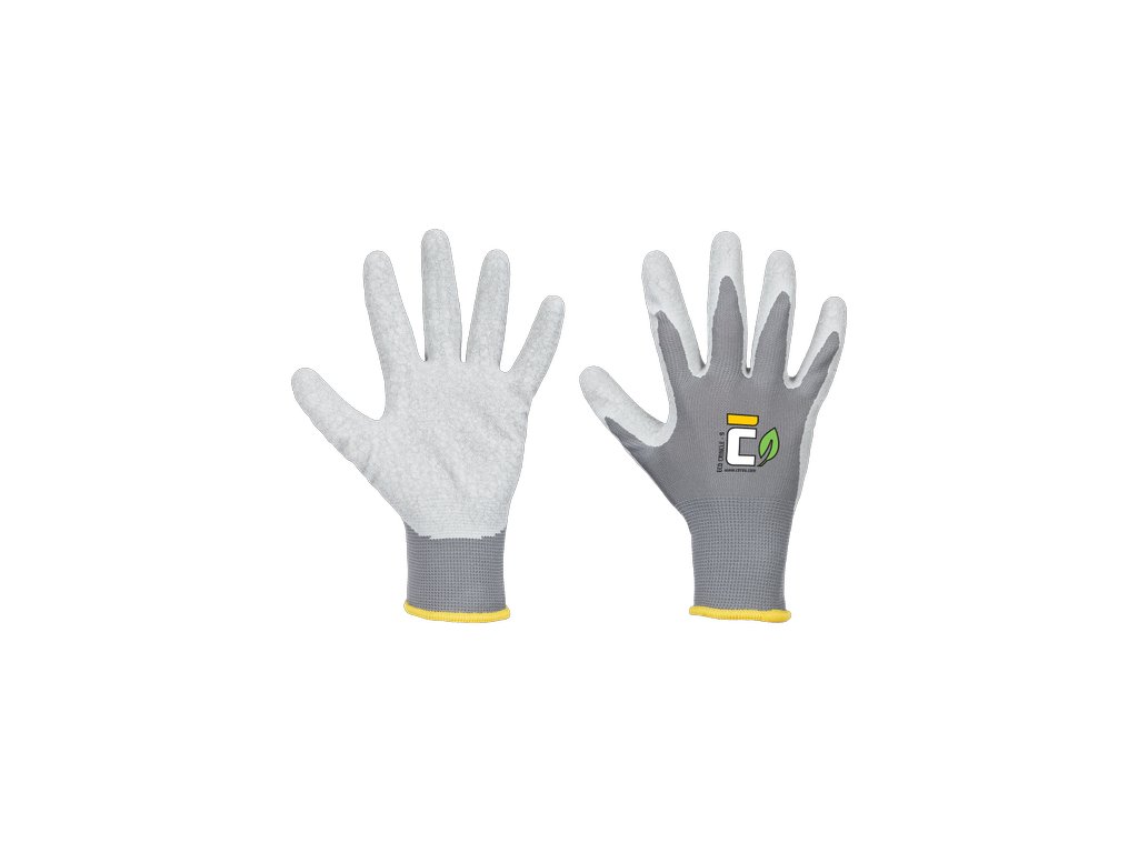 • odolné eco-frindly pracovní rukavice • pětiprsté bezešvé rukavice jsou vyrobeny z šedé recyklované polyesterové příze, která zajišťuje pevnost a pohodlí po celý den • dlaň je potažena šedým zvrásněným latexem, který zajišťuje vynikající přilnavost a odolnost proti oděru za sucha i za mokra • ideální volba pro náročnou práci