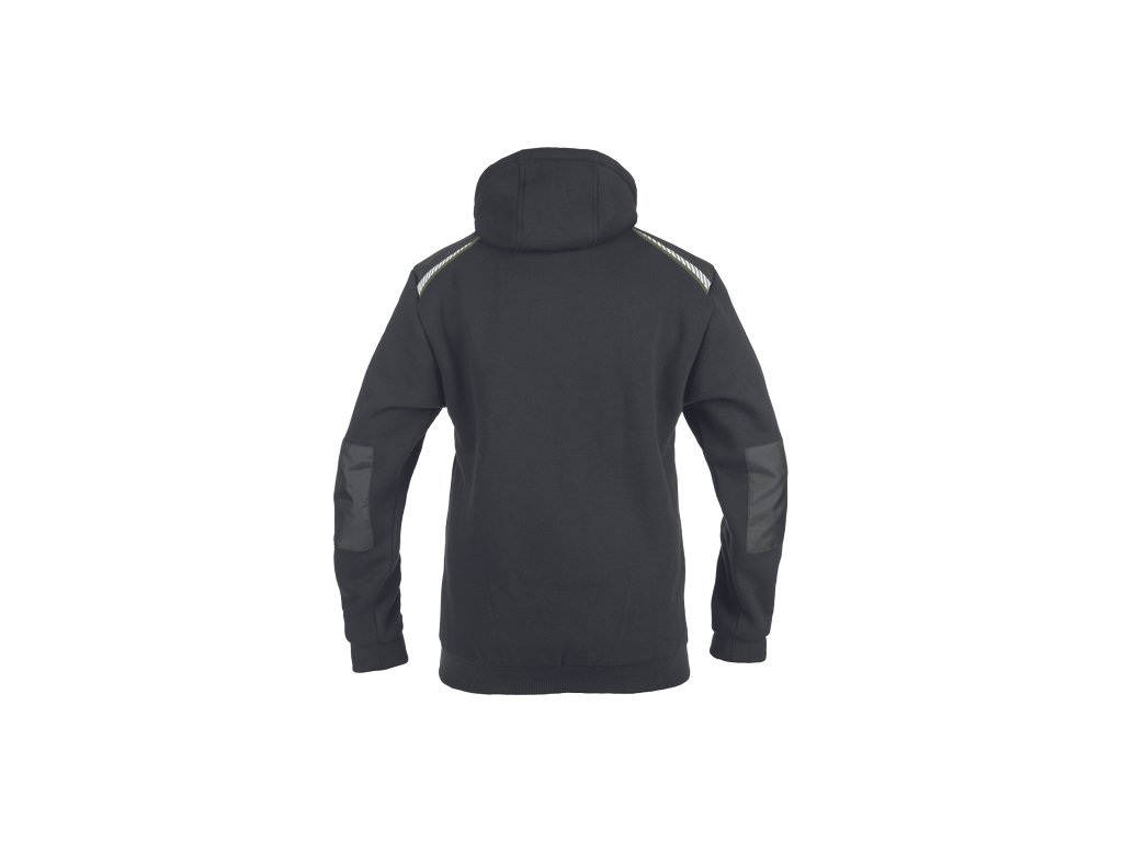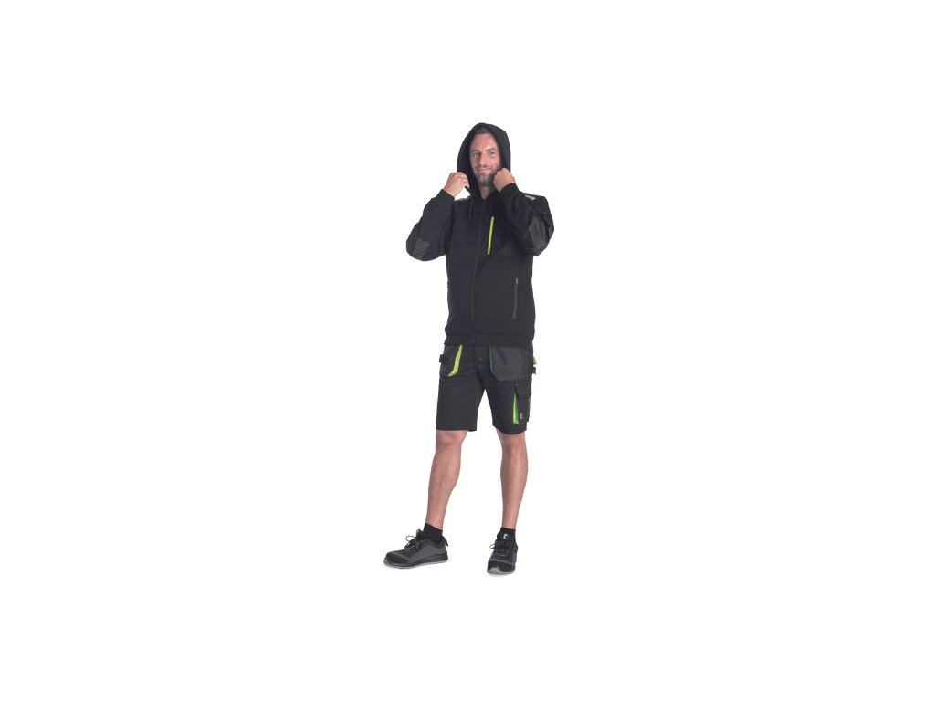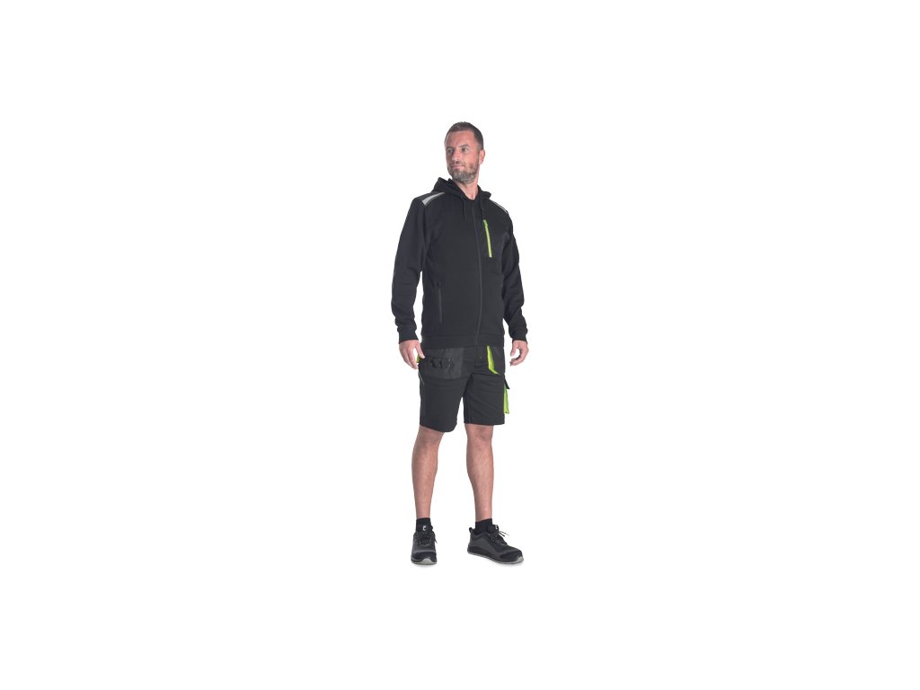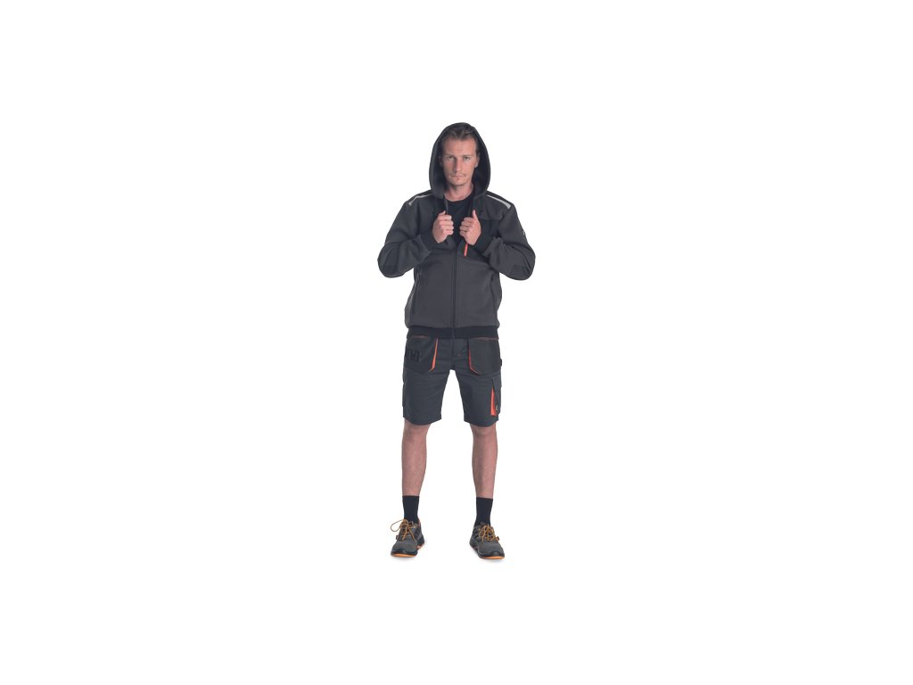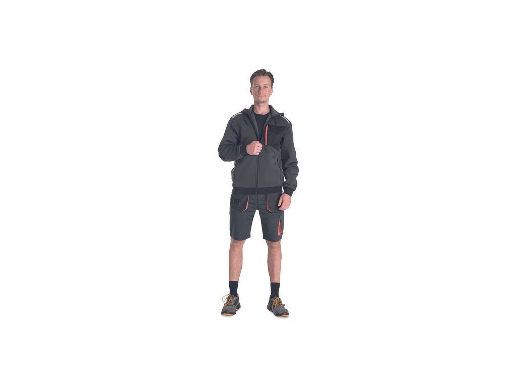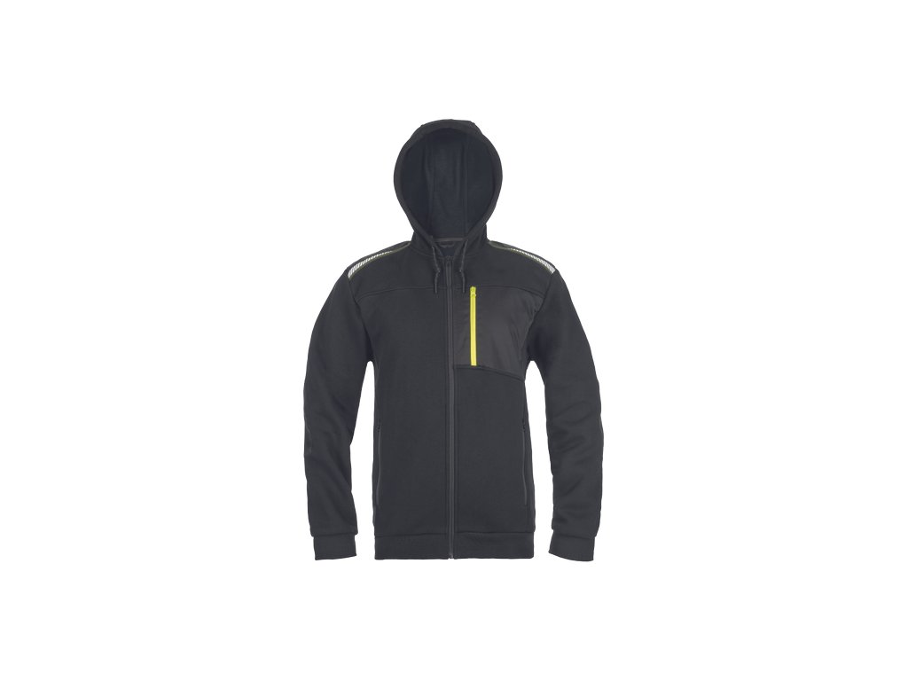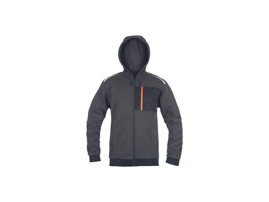 • pánská mikina s kapucí se zapínáním na zip • 2 boční kapsy • 1 náprsní kapsa na zip • zesílená ramena s reflexními pruhy • elastický spodní lem a manžety rukávů