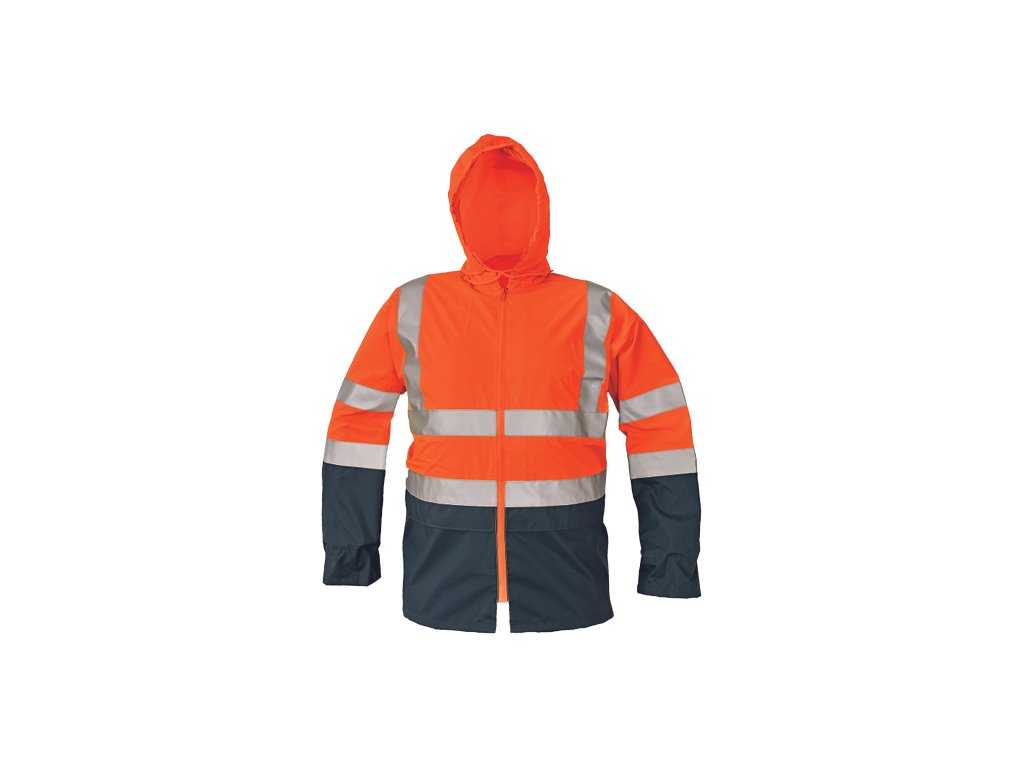 • pánská HI-VIS bunda bez podšívky s kapucí skrytou v límci, podlepené švy • vysoká voděodolnost, paropropustná • reflexní 3M pruhy přes ramena, po obvodu boků a rukávů • 2 velké přední kapsy kryté klopou • spodní lem bundy a kapuce stažitelná na tkaničku