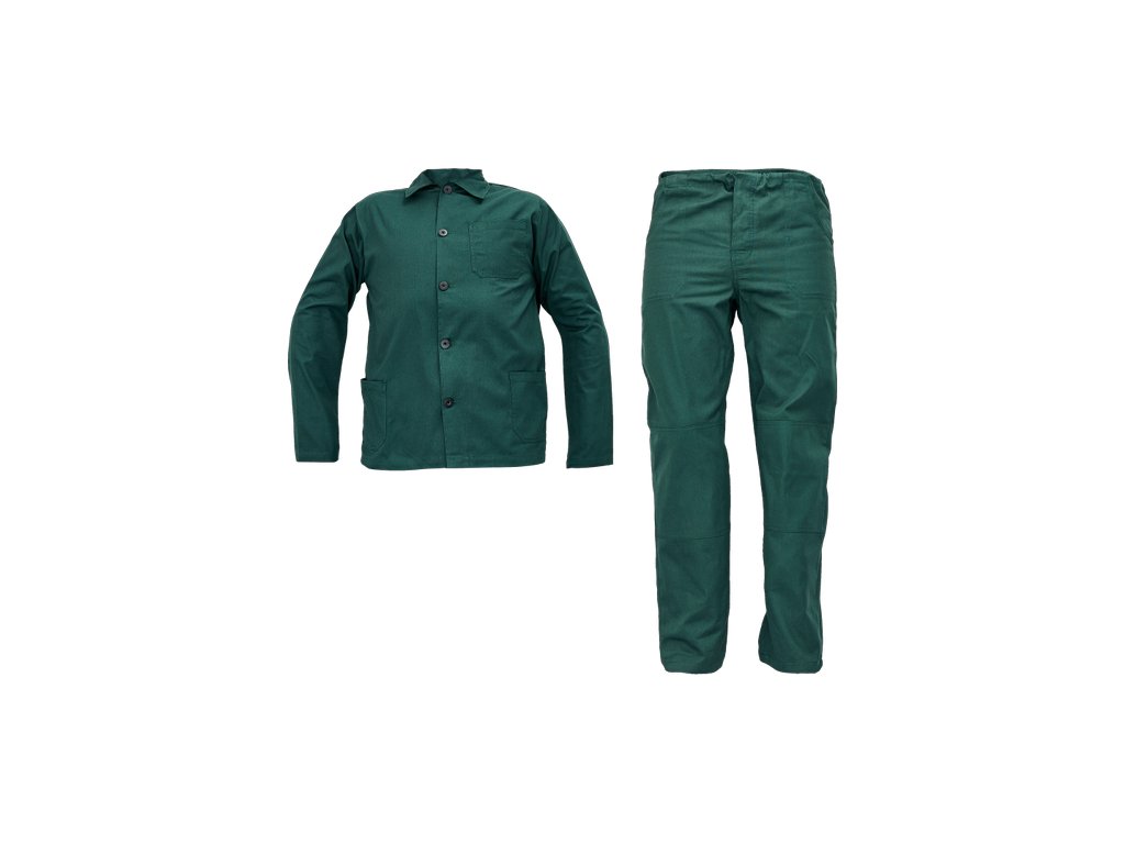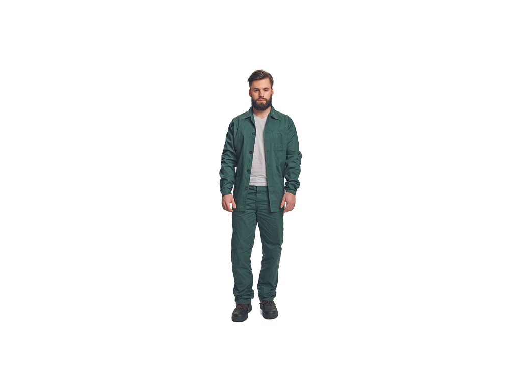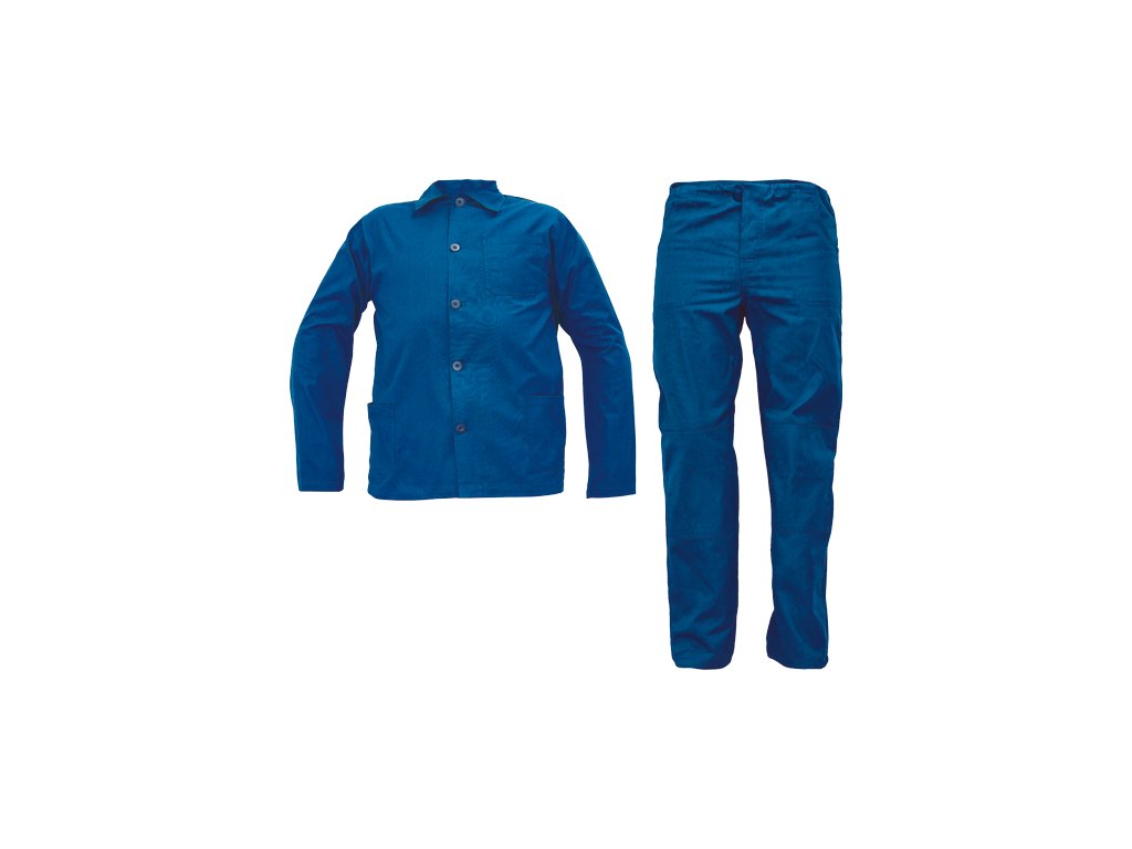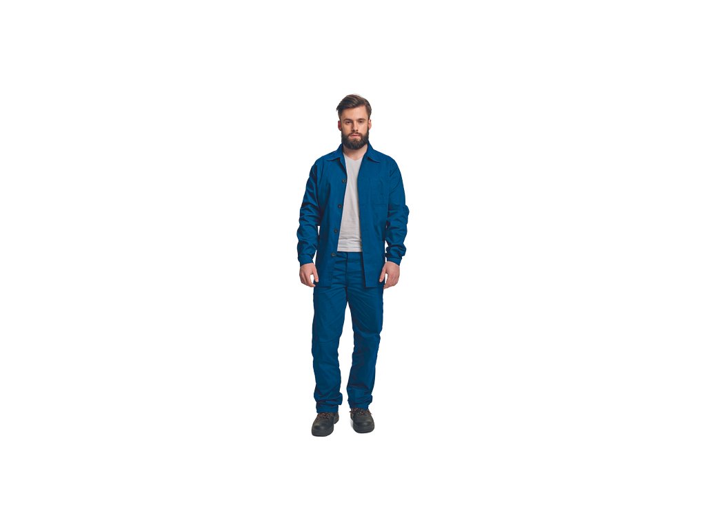 • pánská pracovní souprava • BUNDA - s límcem a zapínáním na knoflíky • 2 přední kapsy • 1 náprsní kapsa • KALHOTY - 2 přední kapsy • 1 zadní kapsu a pas stažitelný na tkaničku