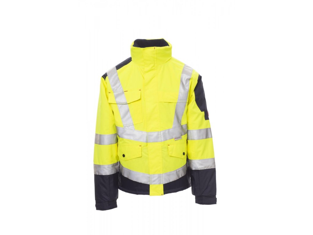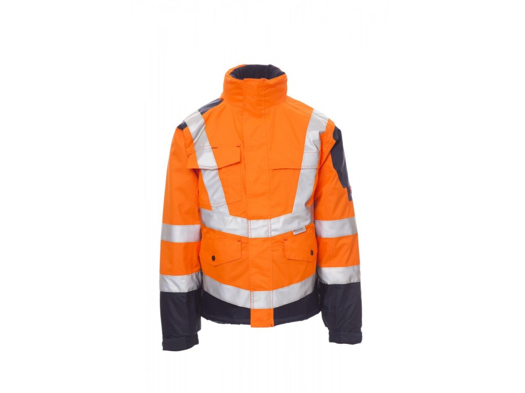 Dvoubarevná bunda s vysokou viditelností, s reflexními pruhy, zapínání na plastový zip s kovovým jezdcem s klopou na suchý zip, tvarovaná kapuce se šňůrkou a/nebo v límci, stahovací manžety. 4 přední kapsy s klopou:kapsa na pravé straně hrudi na suchý zip, kapsa s očkem na tužku a skrytým pouzdrem na jmenovku; kapsa na srdci na skrytý zip; 2 spodní kapsy s vrchním zapínáním na zip a druk a bočním průstřihem. Neodnímatelný zateplený vnitřek, s límcem a nárameníky z mikroflísu, zip na spodní zadní straně pro usnadnění potisků a výšivek, se dvěma pruhy na hrudi, náramenících a rukávech. Tepelně podlepené švy.