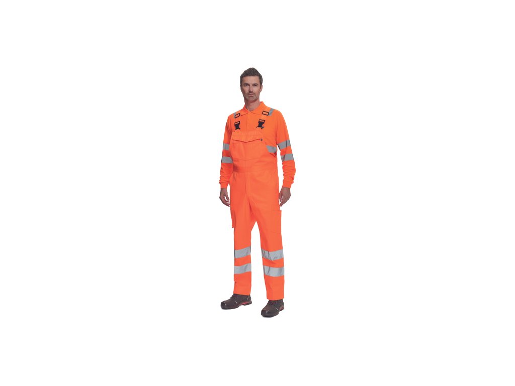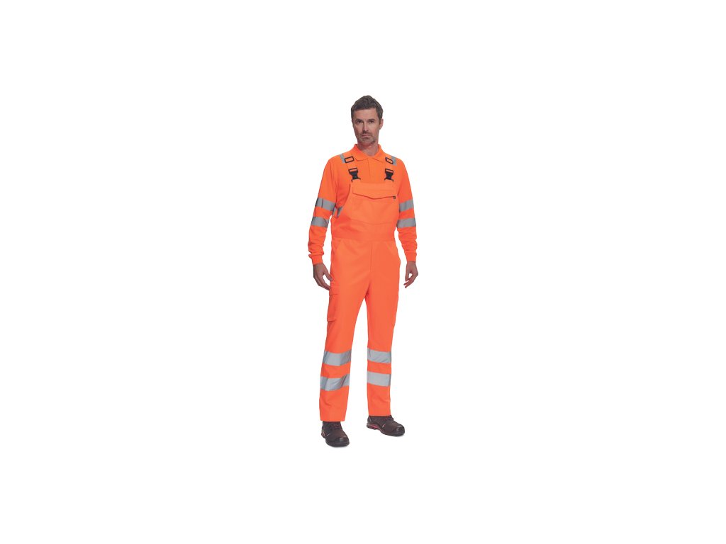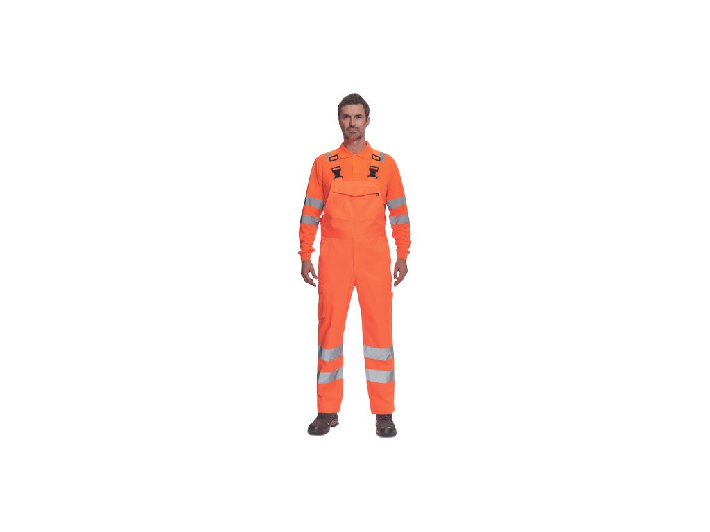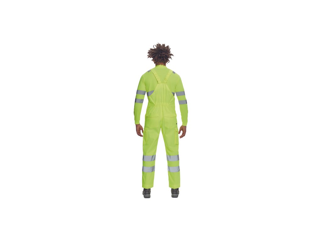 • pánské lehké full HI-VIS pracovní kalhoty s laclem a reflexními pruhy na nohavicích, elastický pas • 2 boční kapsy, 1 kapsička na mince • 2 multifunkční stehenní kapsy, 2 zadní kapsy • 1 velká multifunkční náprsní kapsa • elastické šle se zapínáním na spon • nastavitelná délka nohavic