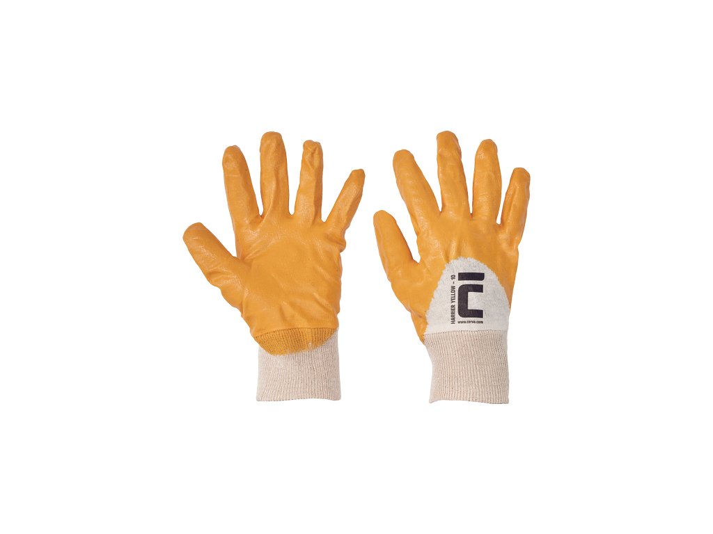 • rukavice šité z bavlněného úpletu • polomáčené ve žlutém nitrilu • s pružnou manžetou