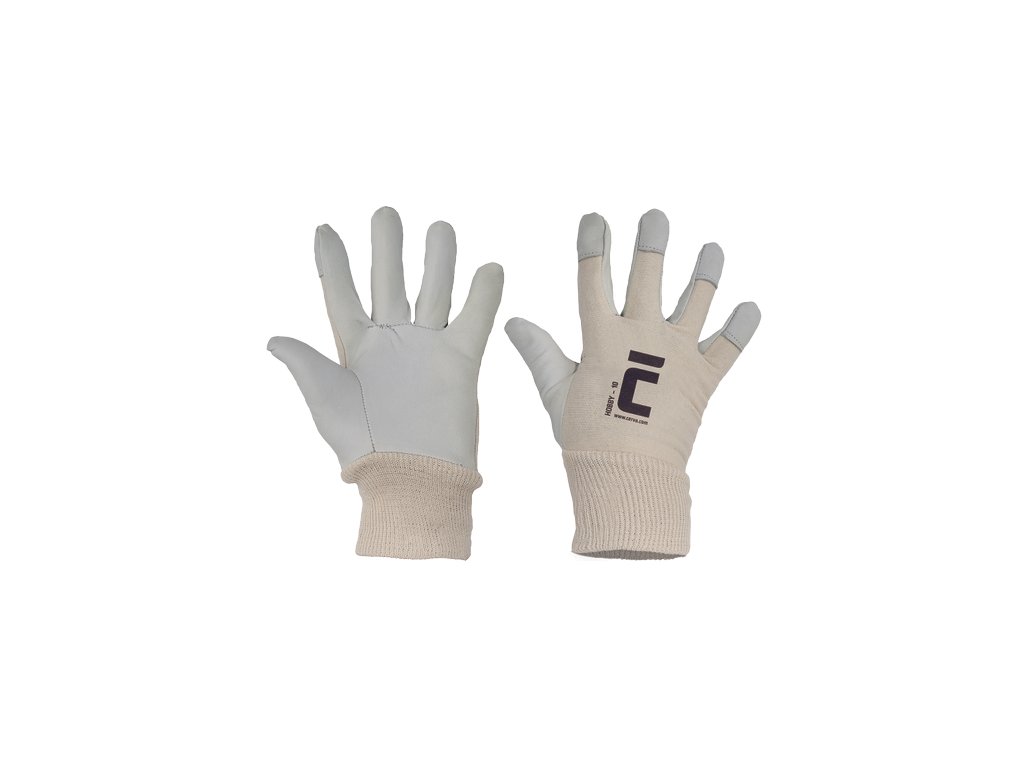 • rukavice z lícové ovčiny v dlani • bavlněná tkanina na hřbetu • s překrytými špičkami prstů • náplet na zápěstí