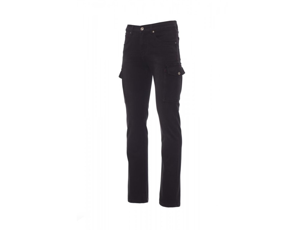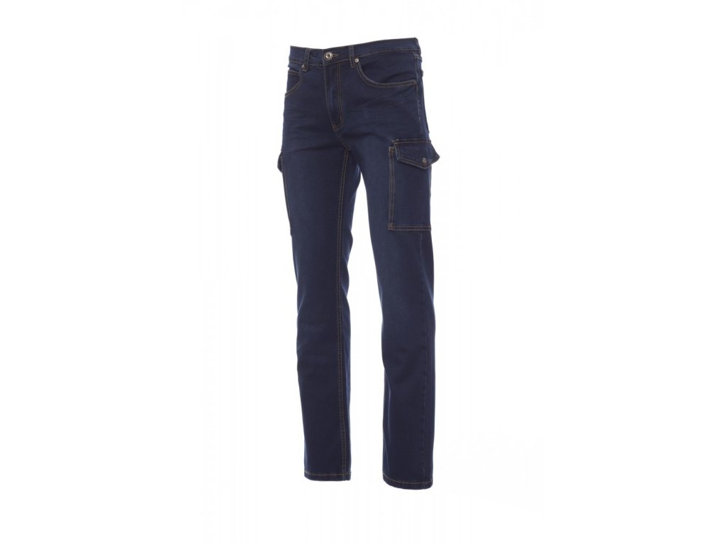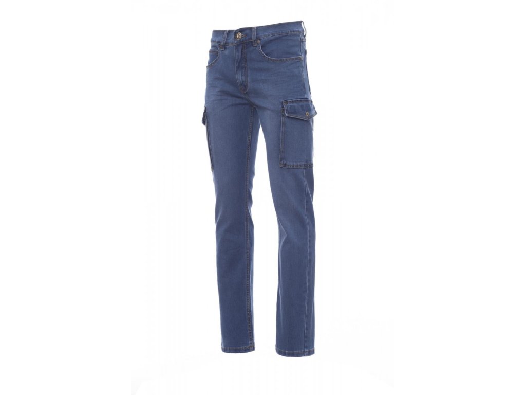 Pánské kalhoty džínového střihu, s pěti kapsami, dvě postranní kapsy LOCK SYSTEM s malým klínkem, zapínání na kovový zip a knoflík, poutka v pase, stone washed, opotřebený a vybledlý efekt, kontrastní odolné prošití, dvojité prošití na vnitřní straně nohavic, rovný střih, cvočky, záplaty z pravé kůže. Hmotnost látky: 12oz/yd?.