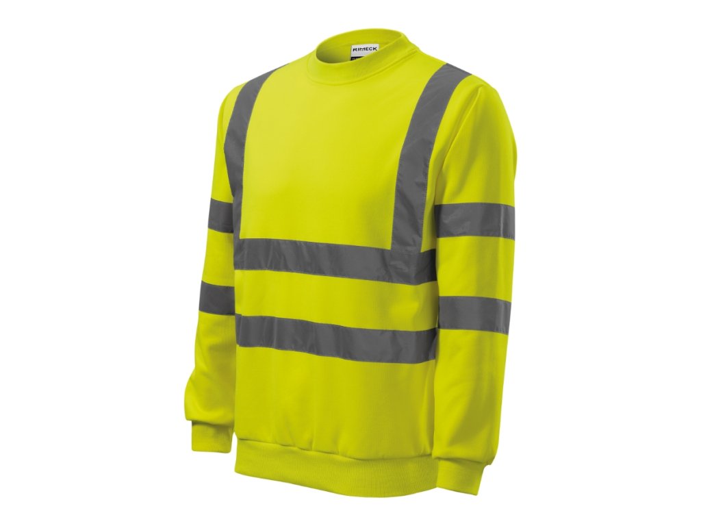 oděv s vysokou viditelností, hladký fluorescenční materiál, vnitřní strana počesaná, certifikované retroreflexní pruhy 3M, rovný střih s bočními švy, dolní lem, manžety a průkrčník z žebrového úpletu 1:1, certifikace dle norem EN ISO 20471/A1 (třída 3) a EN ISO 13688