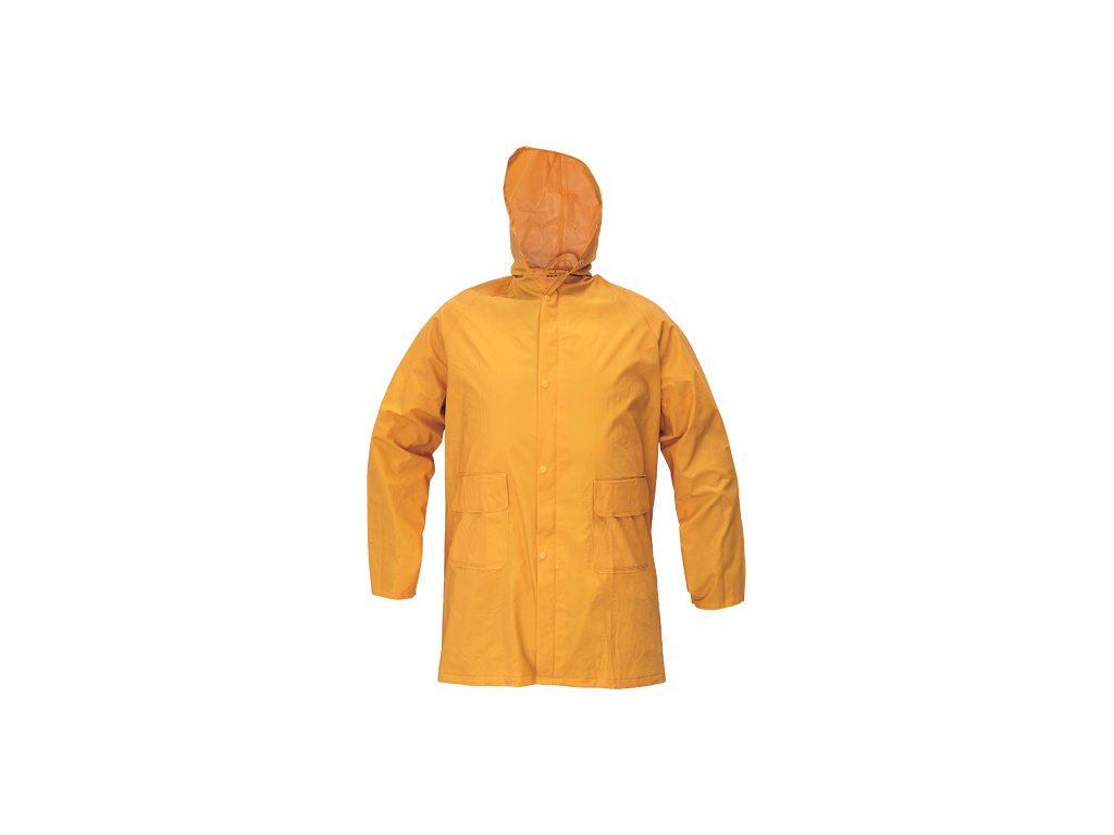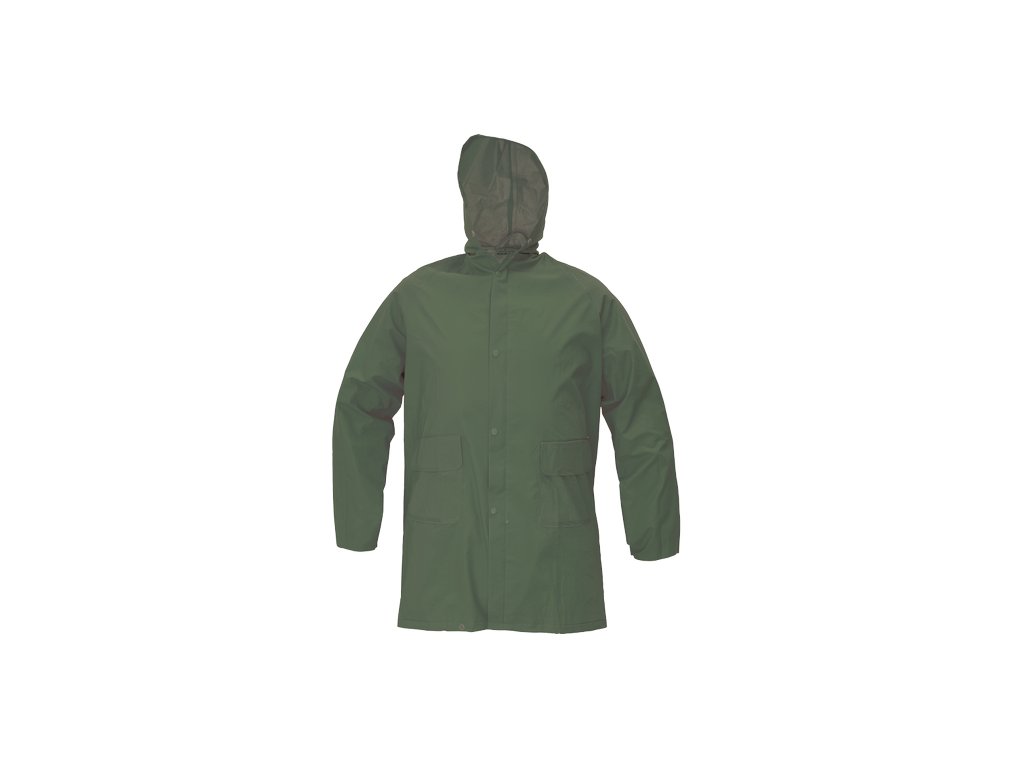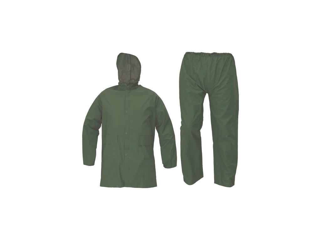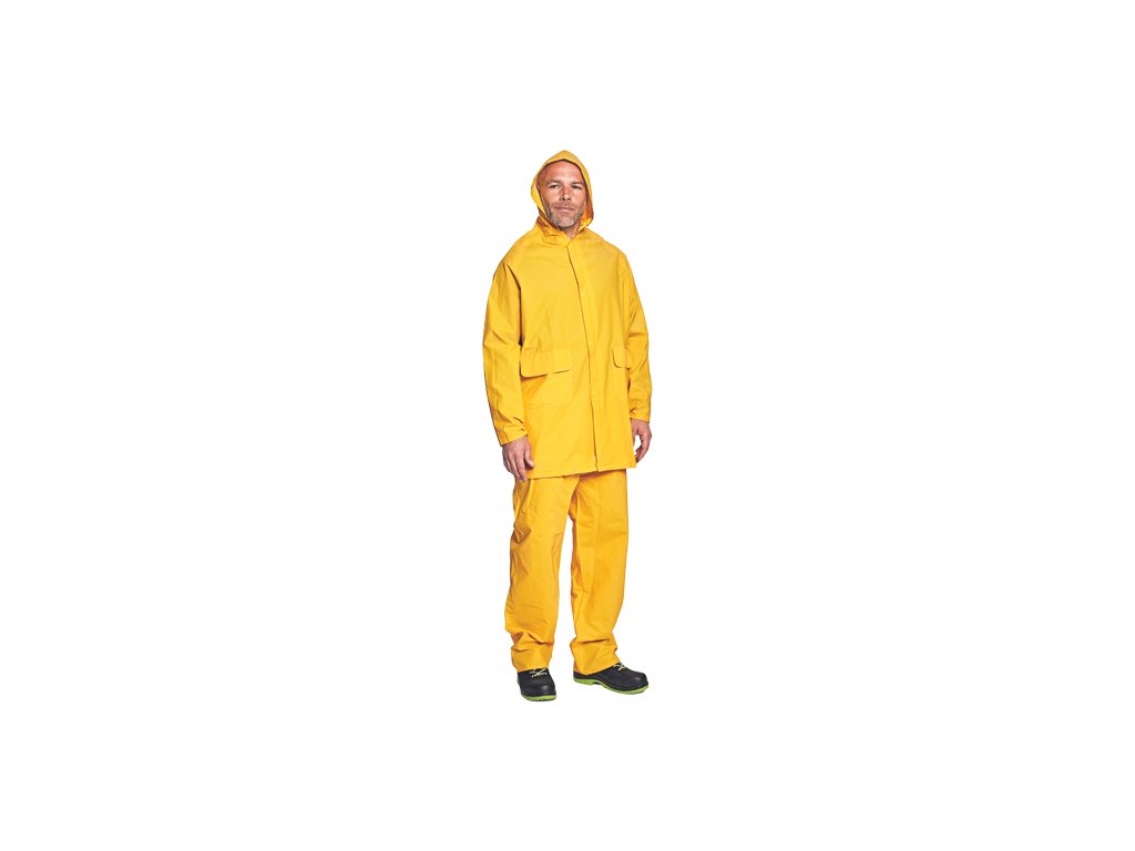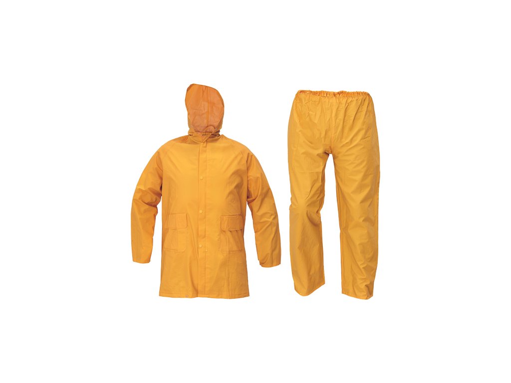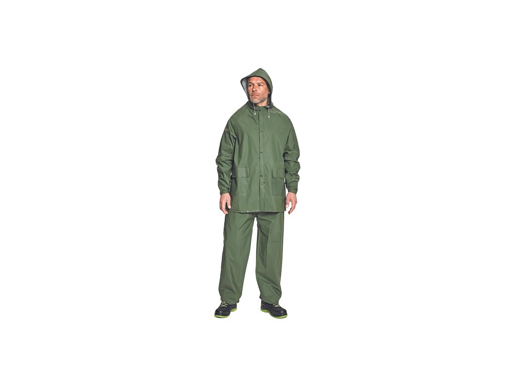 • voděodolný dvoudílný oblek • ¾ plášť s kapucí a kalhoty v pase na gumu • všechny spojovací švy jsou zatavené • materiál s nánosem PVC • dvě přední kapsy kryté légami proti průniku vody • spodní část rukávů lze regulovat drukem • ventilace na zádech a v podpaží