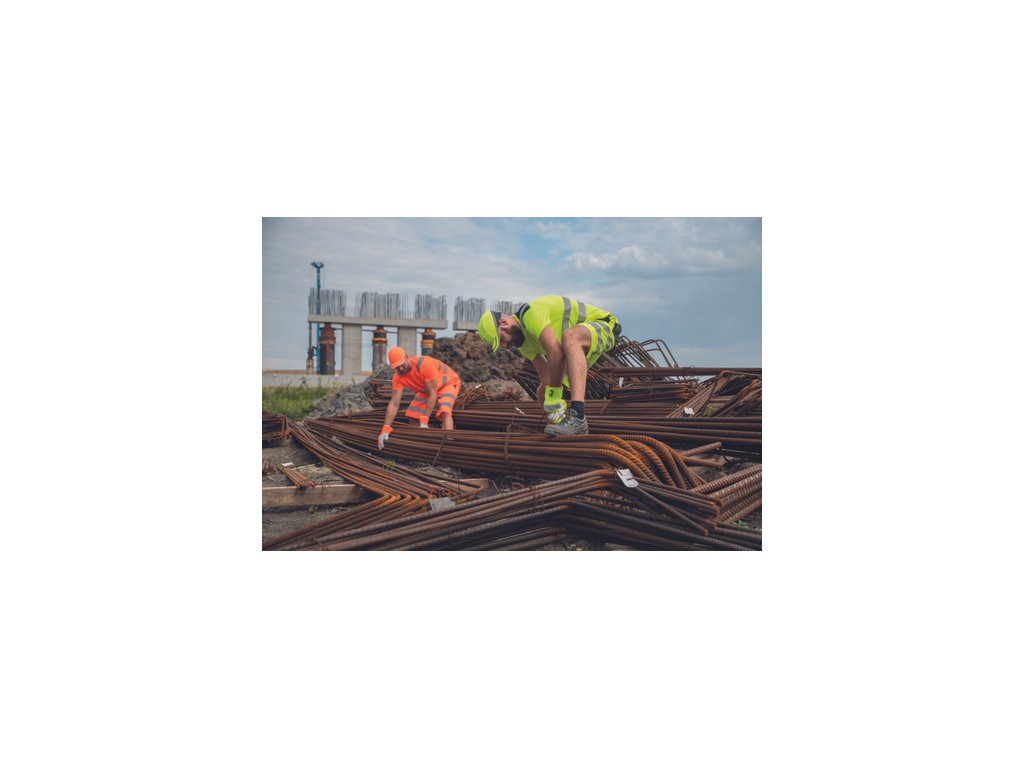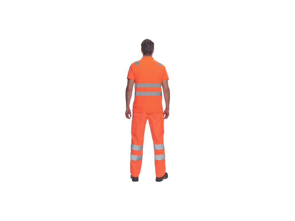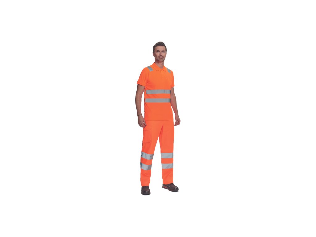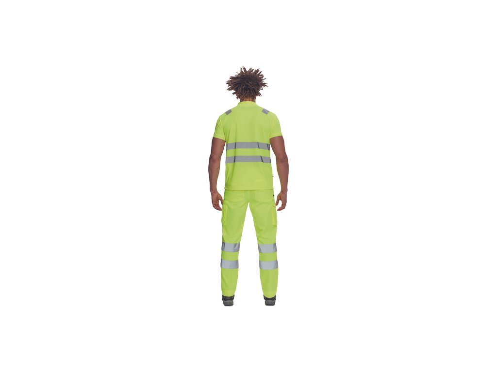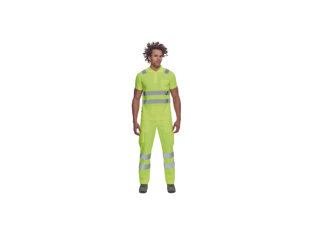 • pánská full HI-VIS polokošile s reflexními pruhy přes ramena a v bocích • zapínání na 3 knoflíky • 1 náprsní kapsička • žebrovaný límeček a lemy rukávů