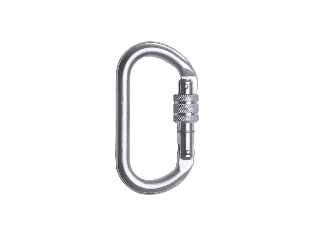 ocelová oválná karabina se šroubovací pojistkou a pevností 20 kN; možnost otevření 18 mm; splňuje normu EN 362
