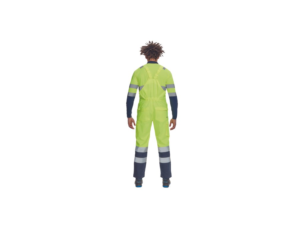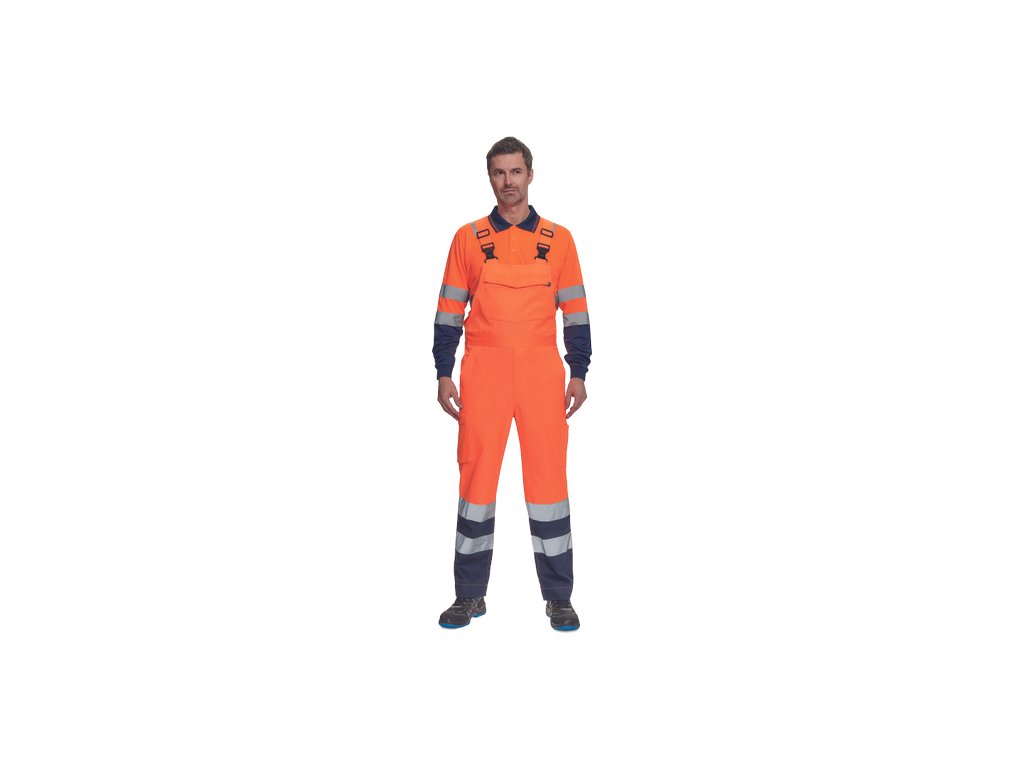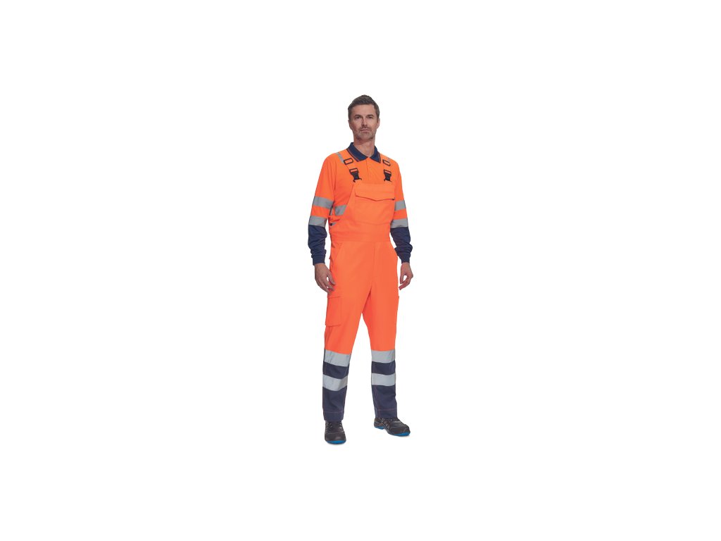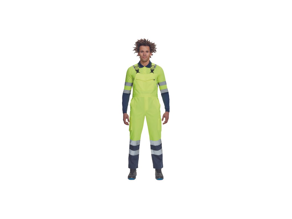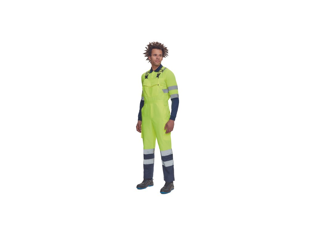 • pánské lehké HI-VIS pracovní kalhoty s laclem a reflexními pruhy na nohavicích, elastický pas • 2 boční kapsy, 1 kapsička na mince • 2 multifunkční stehenní kapsy, 2 zadní kapsy • 1 velká multifunkční náprsní kapsa • elastické šle se zapínáním na sponu • nastavitelná délka nohavic