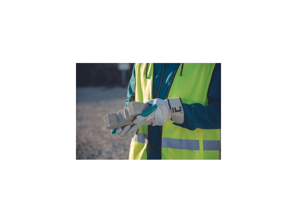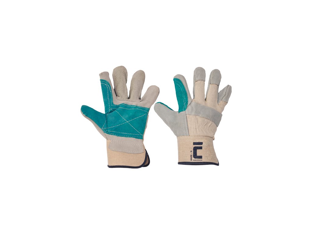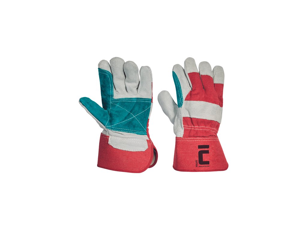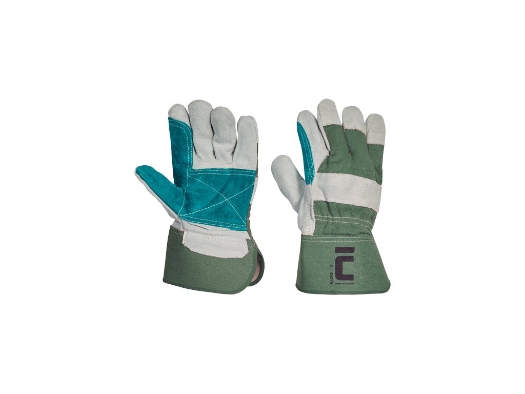 • rukavice z hovězí štípenky s podšívkou a zesílenou vrstvou v dlani • s bílou bavlněnou tkaninou na hřbetu • tuhá manžeta