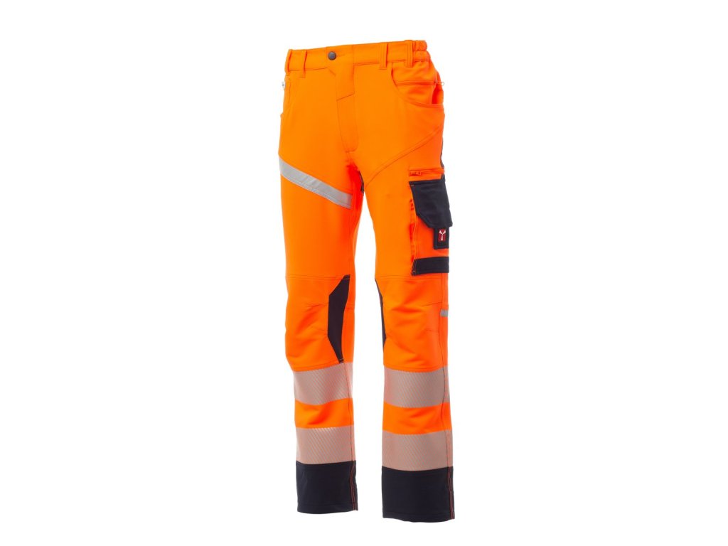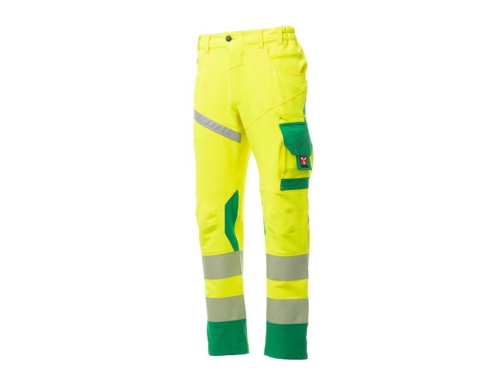 Unisexové kalhoty, tkanina „4 way stretch“, celoroční, s vysokou viditelností, gumičky na bocích a poutka na pásek v pase, zapínání na zip a přizpůsobený knoflík. Na přední straně kalhoty mají dvě zakulacené kapsy, na pravé straně kapsičku na mince a na levé straně bezpečnostní kapsičku na zip. Na přední straně levé nohavice jsou tři kapsy: vodorovná kapsa se zapínáním na zip, kapsa s tvarovanou klopou na suchý zip a pouzdrem na jmenovku, malá svislá kapsa se zapínáním na zip. Na přední straně pravé nohavice je reflexní páska. Na zadní straně je kapsa s klopou na suchý zip, očko na kladivo, otevřená kapsa na svinovací metr a kapsička na smartphone s klopou na suchý zip (pravá nohavice), otevřená kapsa se dvěma reflexními páskami (levá nohavice); reflexní vsadky v ve výšce kolen a kontrastní látkové patní chrániče na obou nohavicích. Segmentované a tepelně svařené reflexní pásky pro snadnější pohyb. Boční prošívání a kontrastní výztuže na různých místech.