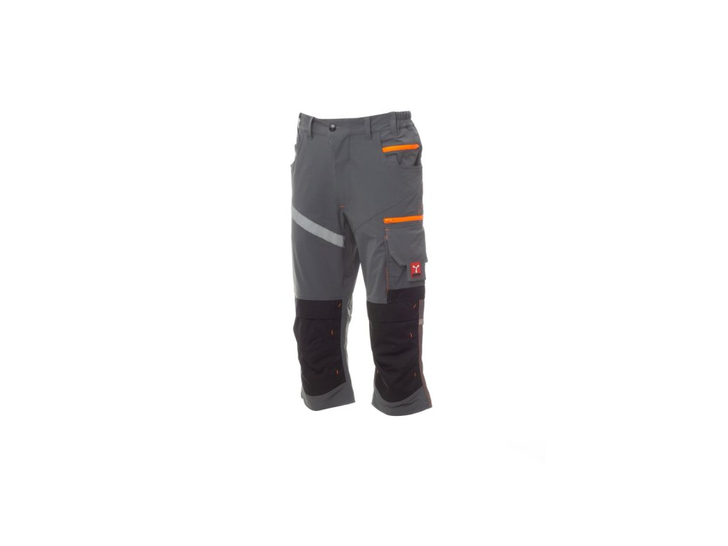 Unisexové pirátské kalhoty (3/4), tkanina „4 way stretch“, gumičky na bocích a poutka na pásek v pase, zapínání na zip a přizpůsobený knoflík. Na přední straně kalhoty mají dvě zakulacené kapsy, na pravé straně kapsičku na mince a na levé straně bezpečnostní kapsičku na zip. Na přední straně levé nohavice jsou tři kapsy: vodorovná kapsa se zapínáním na zip, kapsa s tvarovanou klopou na suchý zip a pouzdrem na jmenovku, malá svislá kapsa se zapínáním na zip. Na přední straně pravé nohavice je reflexní páska. Obě nohavice mají připevnění pro chrániče kolen z Nylon Oxford 500D s rozepínáním seshora. Na zadní straně je kapsa s klopou na suchý zip, očko na kladivo, otevřená kapsa na svinovací metr a kapsička na smartphone s klopou na suchý zip (pravá nohavice), otevřená kapsa se dvěma reflexními páskami (levá nohavice), reflexní vsadky ve výšce kolen pro obě nohavice. Boční prošívání a kontrastní výztuže na různých místech. Italské prostřední velikosti 48-50-52 mají vnitřní délku nohavic 51 cm.