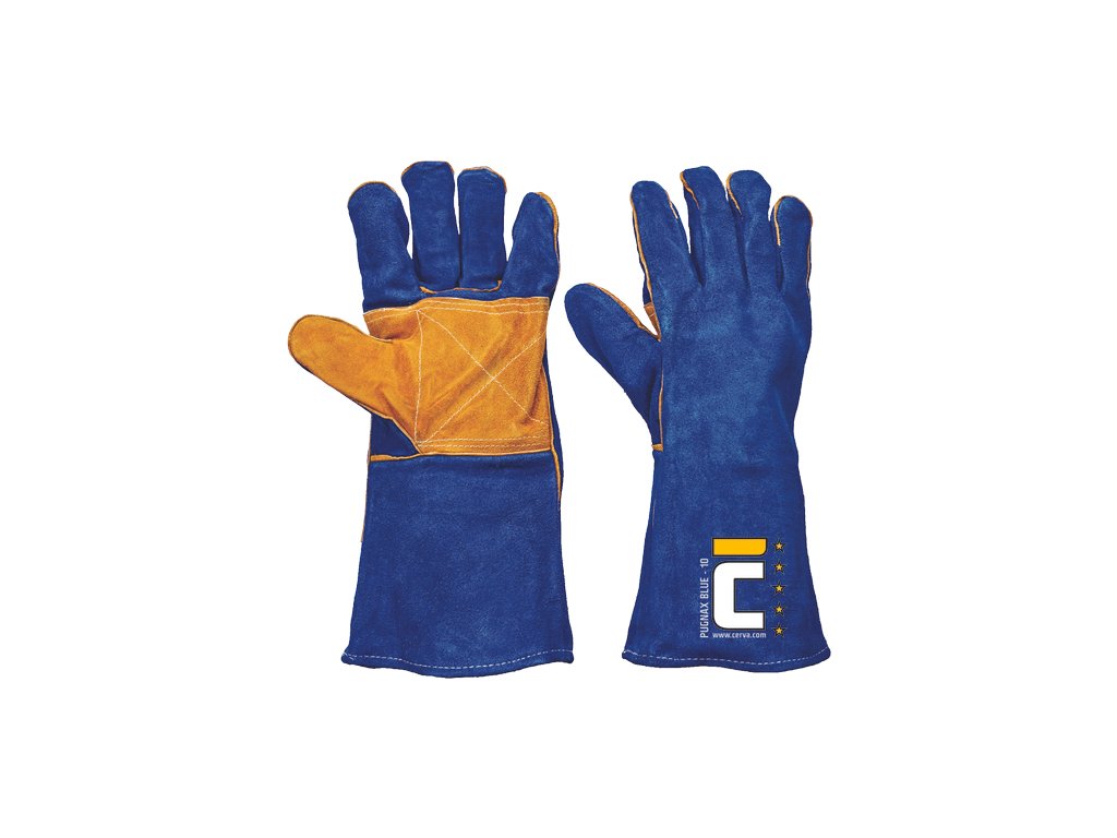 • celokožené svářečské rukavice z hovězí štípenky o délce 35 cm • s výztuhou ve svírací části mezi dlaní a palcem • šité Kevlarovou nití
