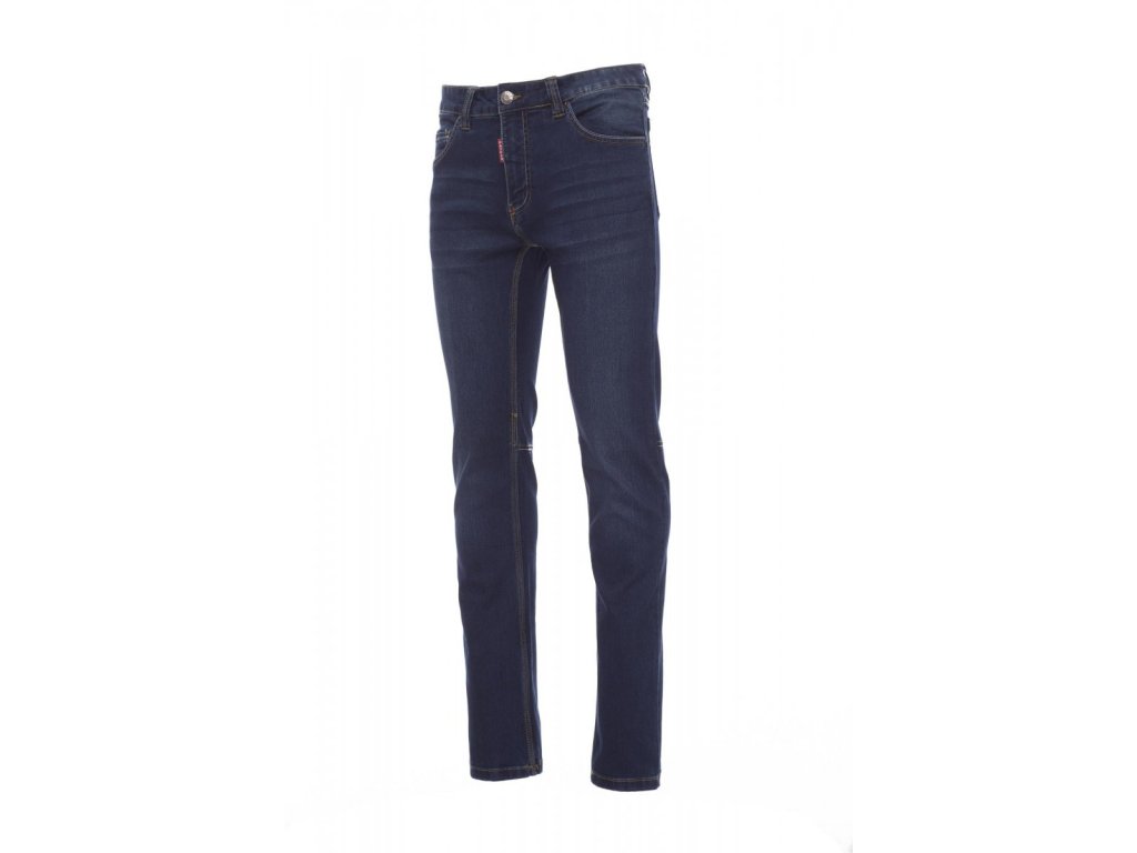 Pánské kalhoty džínového střihu, s pěti kapsami, zapínání na kovový zip a knoflík, poutka v pase, 1 skrytá kapsa na svinovací metr, 1 kapsička na tužky a cutter, ošetření stone washed, efekt obnošení a oprání, úzké nohavice, kontrastní odolné trojjehlové prošití na vnitřní straně nohavice. Hmotnost látky: 10,50oz/yd?.
