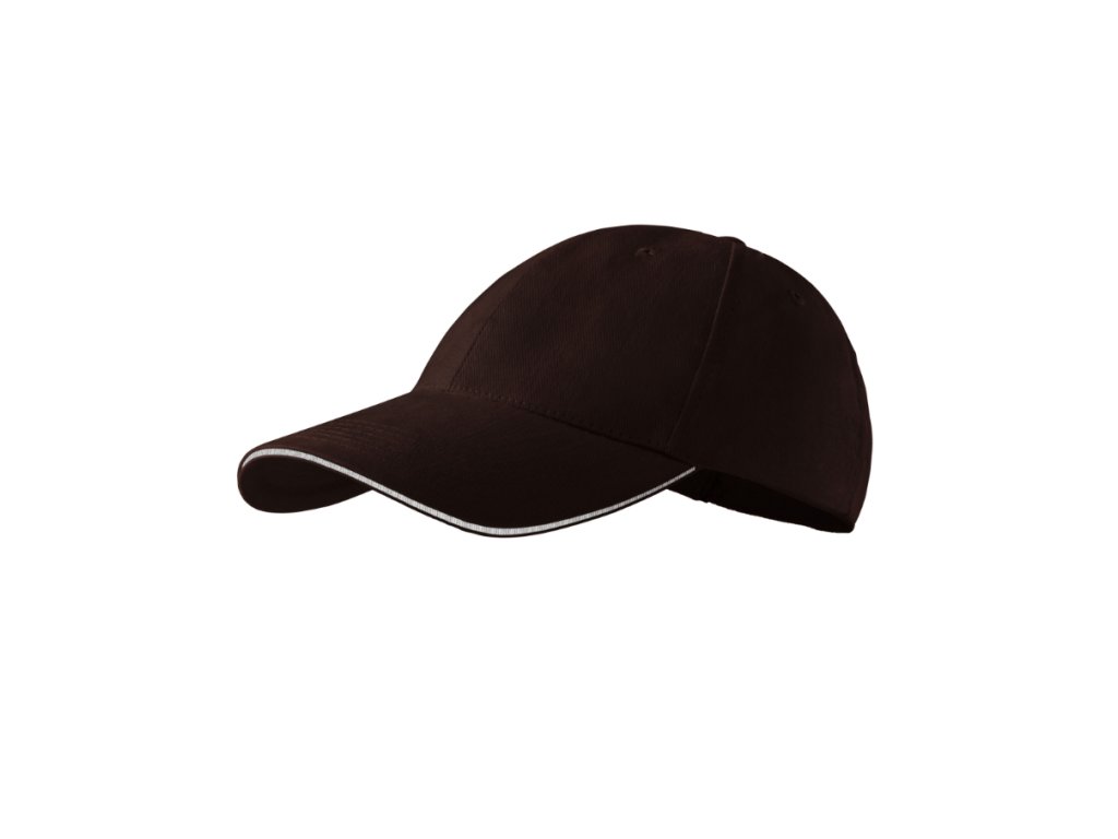 šestipanelový střih, vyztužené 2 přední panely, prošívaný, lehce prohnutý kšilt s konstrastním proužkem, obšité větrací otvory, potící páska, velikost nastavitelná mosazným klipem