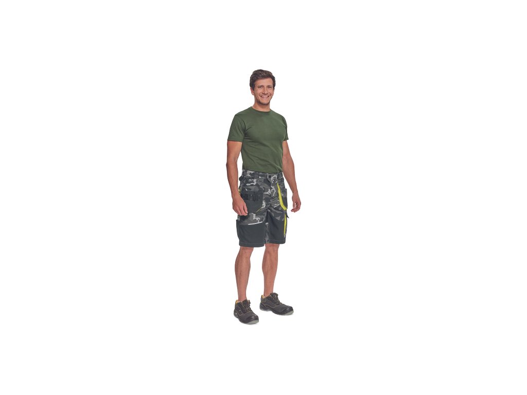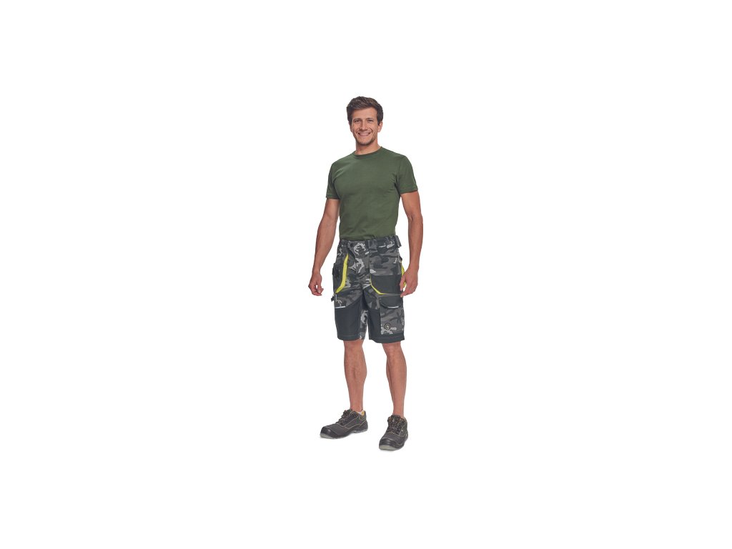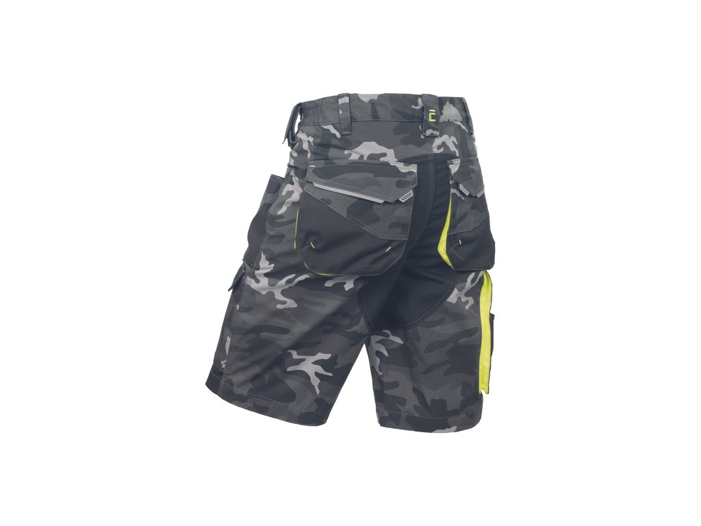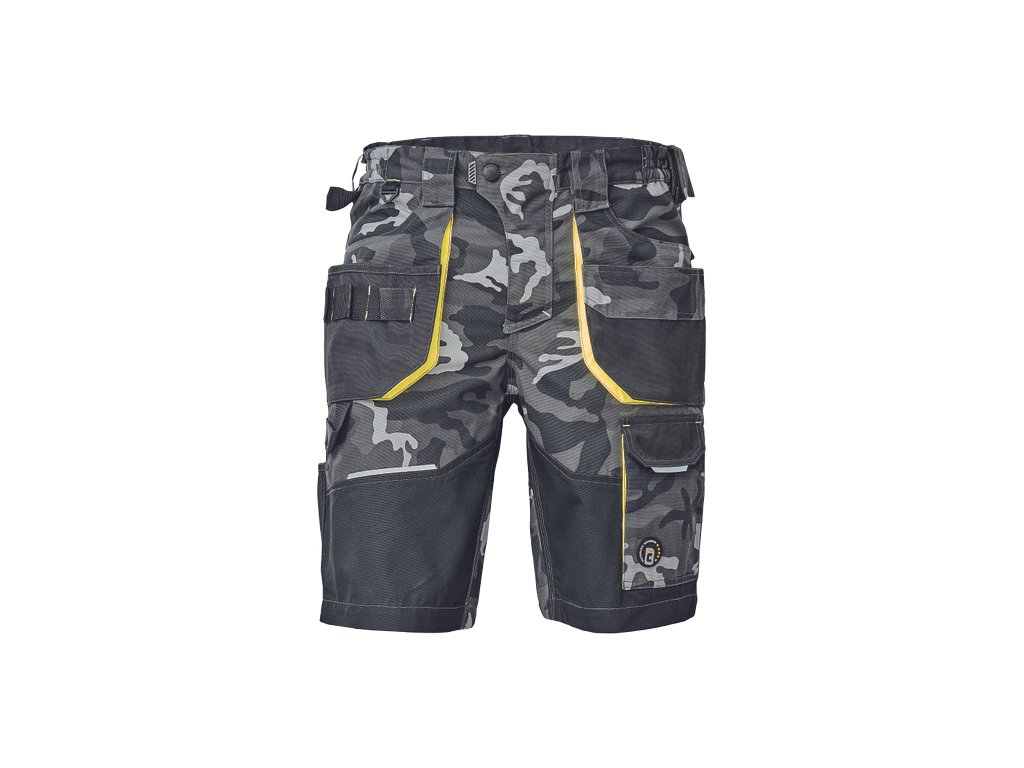 • pánské pracovní šortky s pružným pasem a multifunkčními kapsami • v moderní úpravě šedé kamuflážové barvy • Oxford 600D zesílené spodní částí kapes • odolné trojité prošití nohavic a sedu • reflexní prvky
