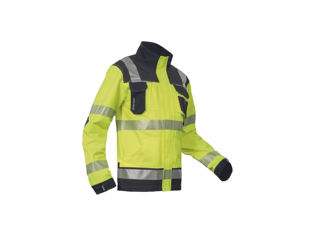 • pánská pracovní HI-VIS bunda • zapínání kryté légou na suchý zip • 2 přední kapsy • 2 náprsní kapsy • 1 náprsní kapsa na mobilní telefon • Oxford 600D zesílení loktů a ramen • tištěné reflexní segmentované 5 cm pruhy okolo pasu, rukávů a přes ramena • kontrastní prošití