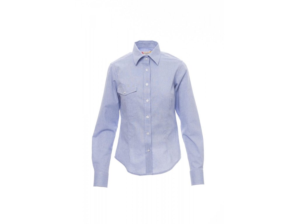 Dámská košile, mírně vyštíhlená, italský límeček, oboustranně prošitá léga s bílým perleťovým knoflíkem, tvarované manžety s 2 knoflíky a knoflíkovou dírkou. Zadní strana: zádové sedlo a svislé záševky, technická kapsa na hrudi s klopou na knoflík a dvě očka na tužku.