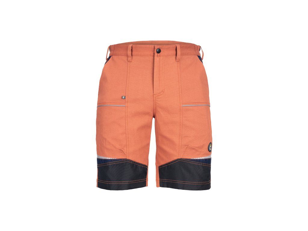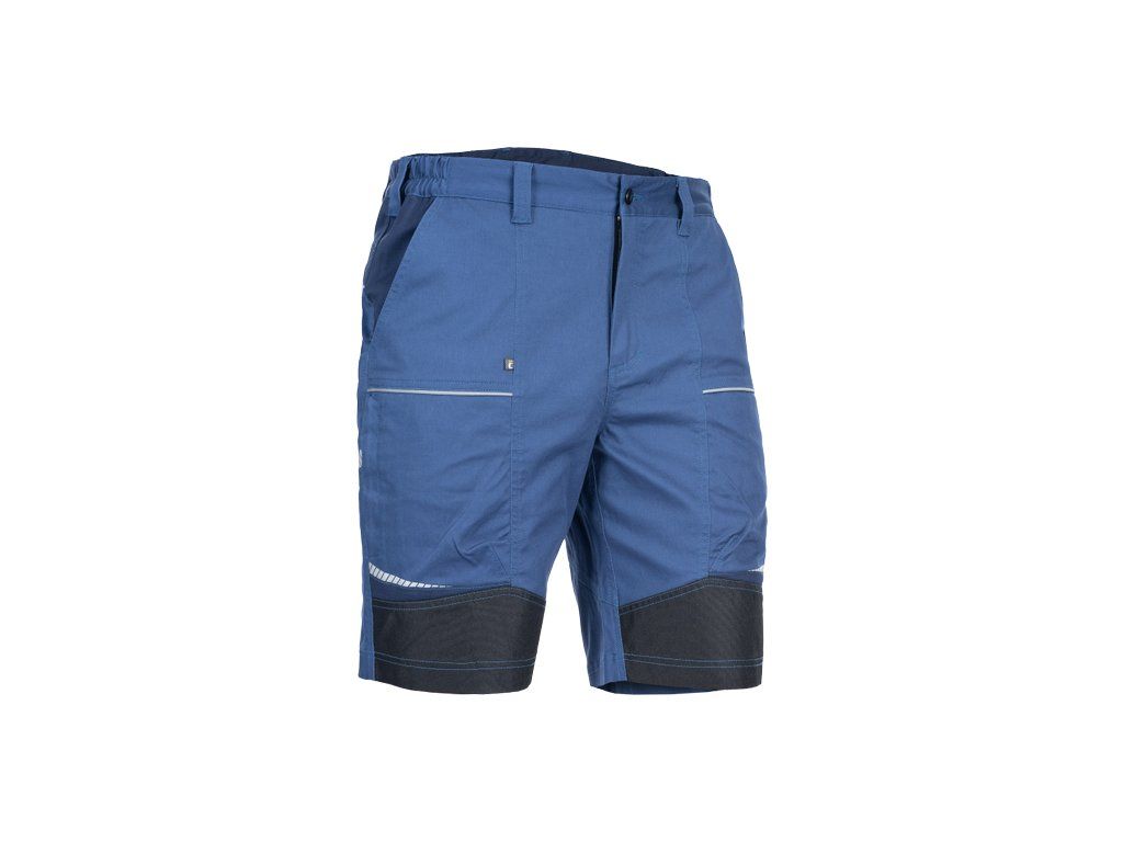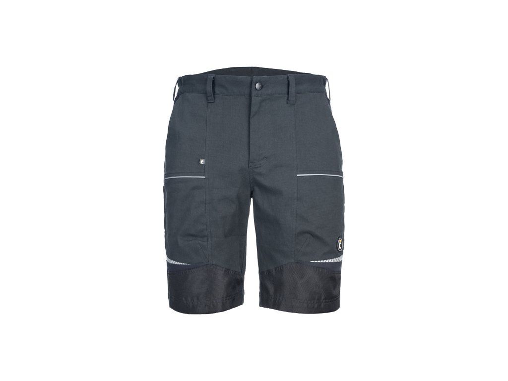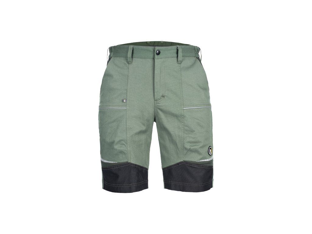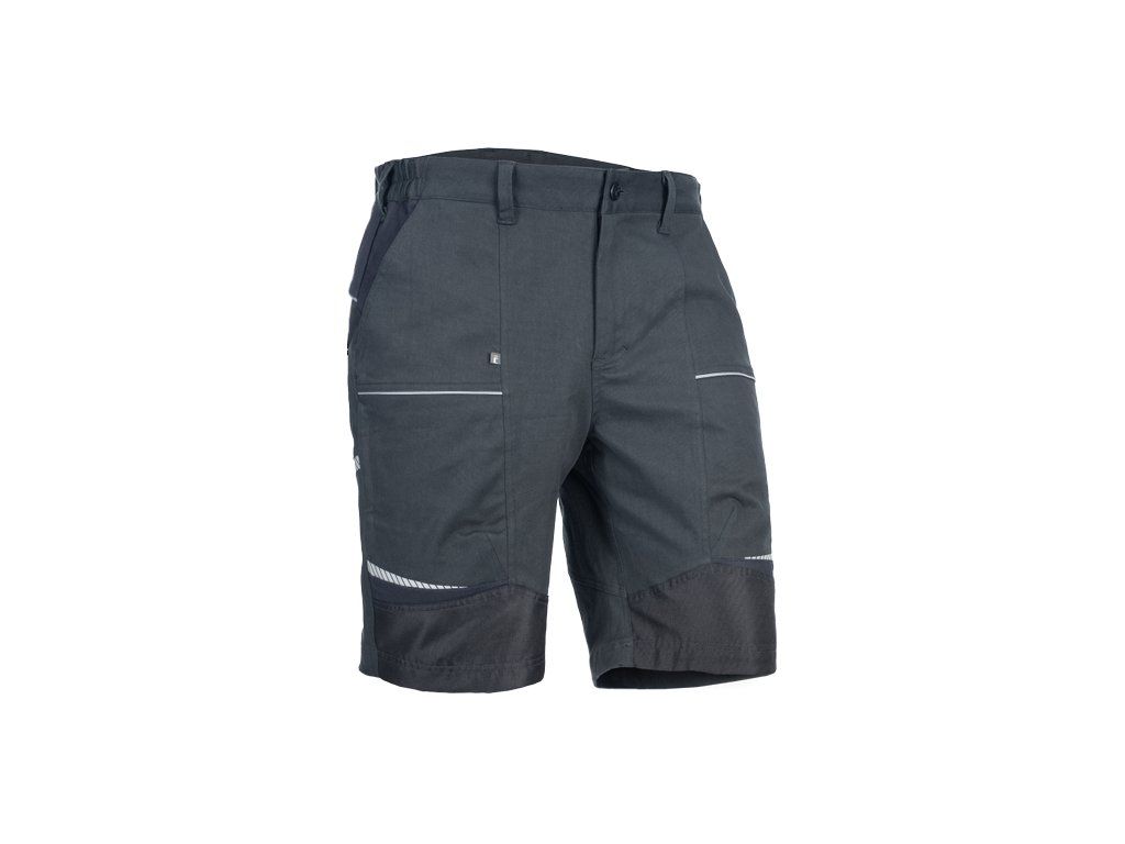• pánské pracovní šortky ze strečové tkaniny • pružný pas s poutky na opasek • 2 přední kapsy, 2 zadní kapsy • 2 stehenní ventilační mesh kapsy na zip • zesílené přední části nohavic • reflexní lemování a tištěné reflexní detaily