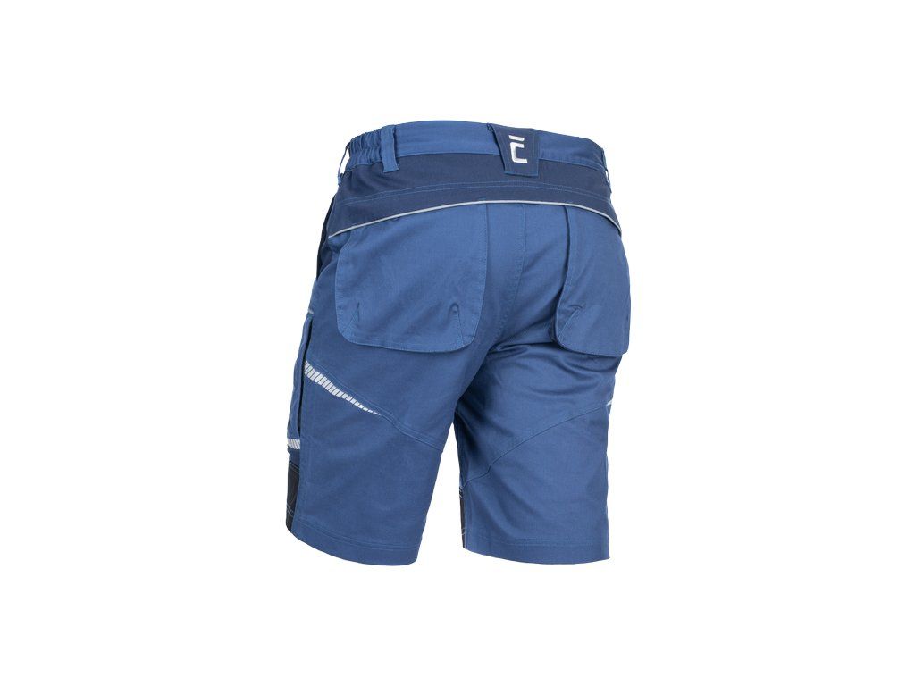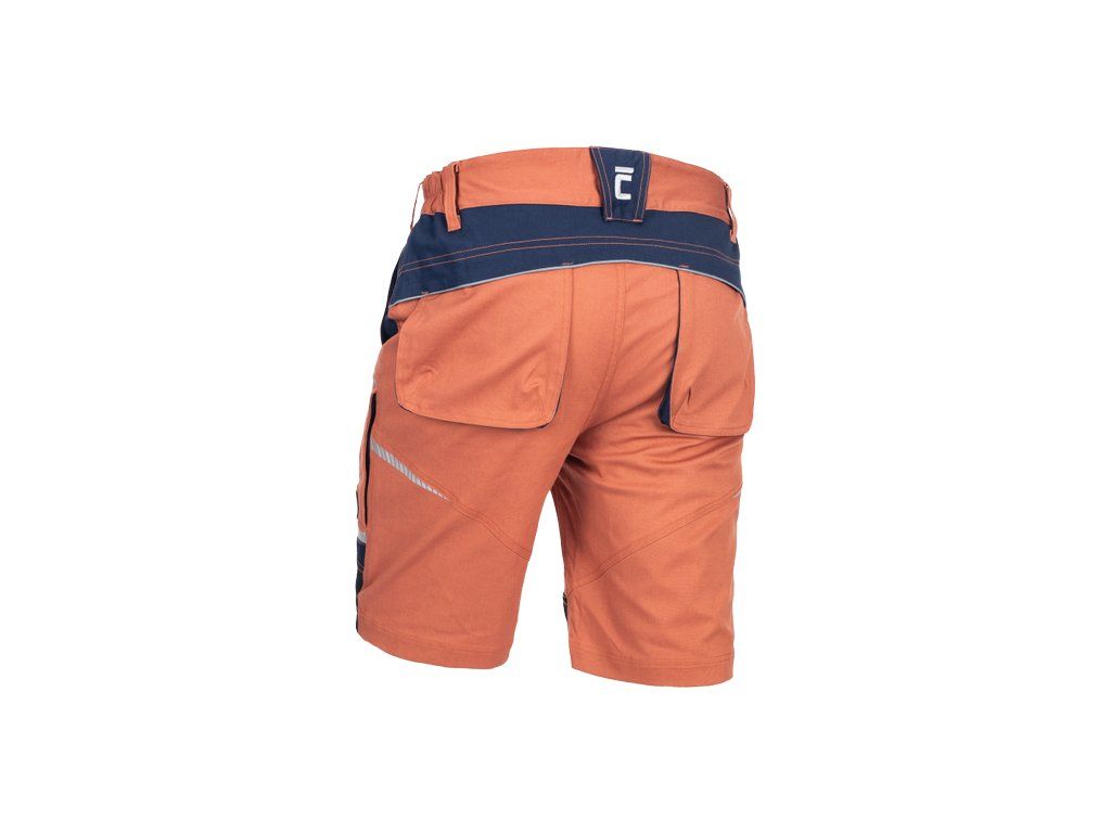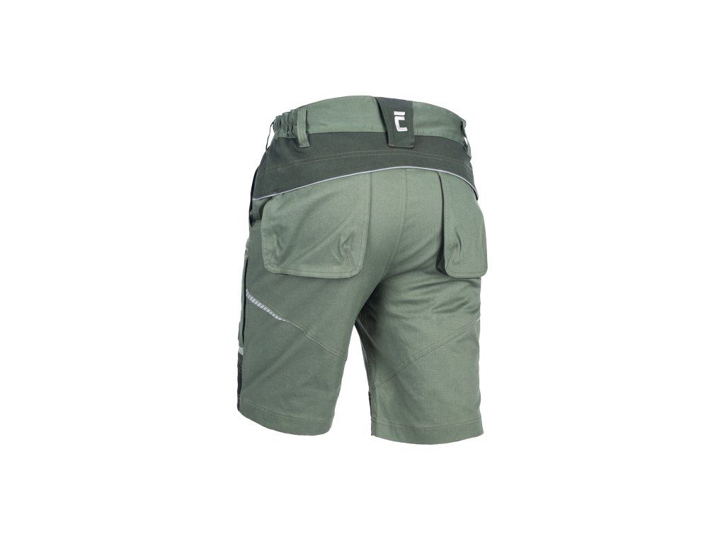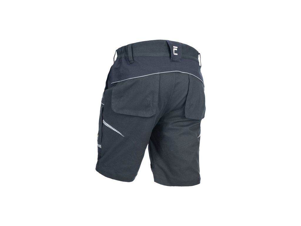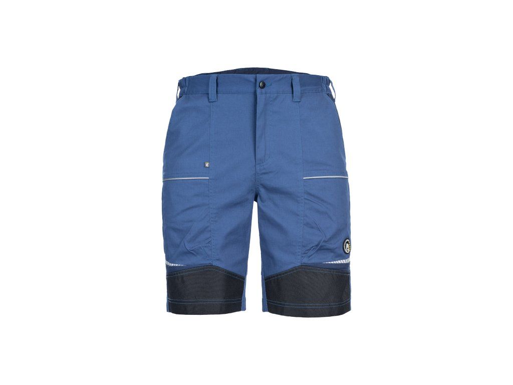 • pánské pracovní šortky ze strečové tkaniny • pružný pas s poutky na opasek • 2 přední kapsy, 2 zadní kapsy • 2 stehenní ventilační mesh kapsy na zip • zesílené přední části nohavic • reflexní lemování a tištěné reflexní detaily