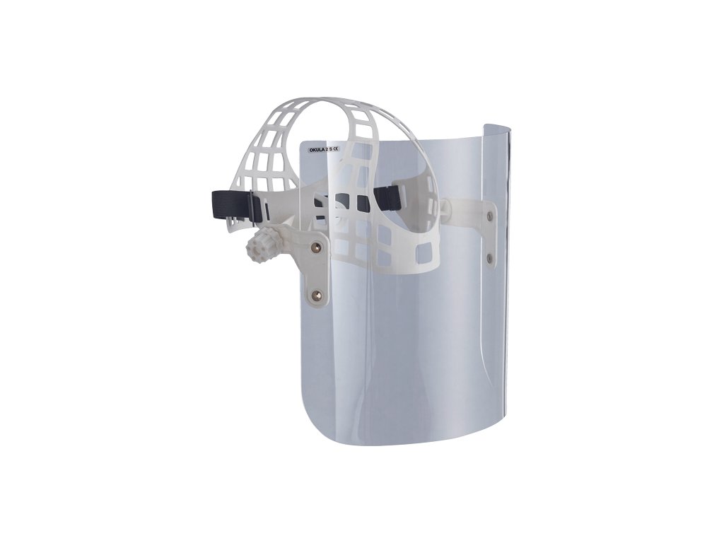 ochranný štít o velikosti 220 x 290 mm z čirého PMMA tl. 2 mm je typem štítu s náhlavním nosičem; je určen k ochraně očí a obličeje proti nárazu pomalu letících částic s dopadovou energií max. 0,56 J; umožňuje současné použití korekčních brýlí; vyhovuje normě EN 166