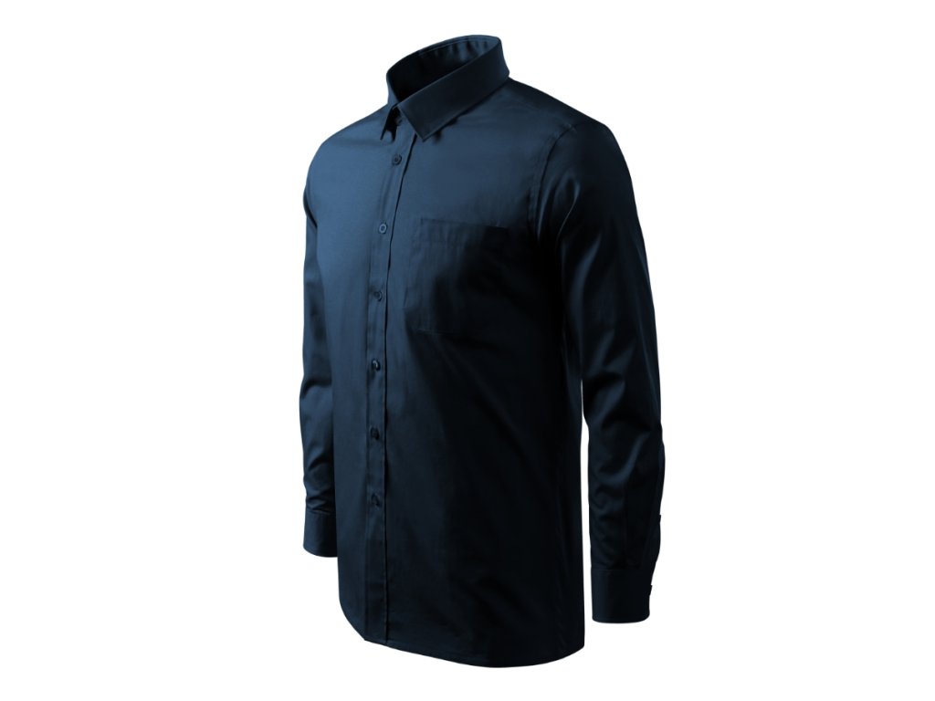 klasický střih s bočními švy, dvojité sedlo a záhyby na zadním dílu, dvoudílný košilový límec, přední kraje začištěny légou, nakládaná náprsní kapsa, dlouhé rukávy s kulatou manžetou na 1 knoflíček, knoflíčky v barvě materiálu (2 náhradní navíc)