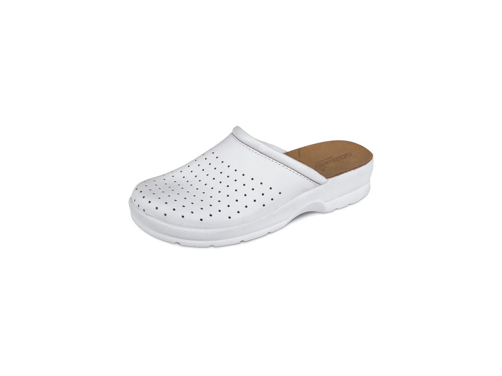 Dámské pantofle. Pohodlná PU podešev opatřená stélkou ze semišové kůže. Perforovaný svršek je vyroben z povrstvené kůže.