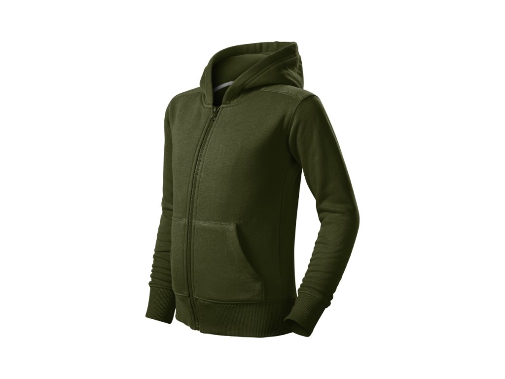 rovný střih s bočními švy, celopropínací kostěný zip, kapuce s podšívkou bez stahovací šňůrky, vnitřní část průkrčníku začištěna kontrastní páskou, nakládané kapsy ve stylu klokanky, dolní lem a manžety rukávů z žebrového úpletu 2:2 s 5 % elastanu, vnitřní strana počesaná