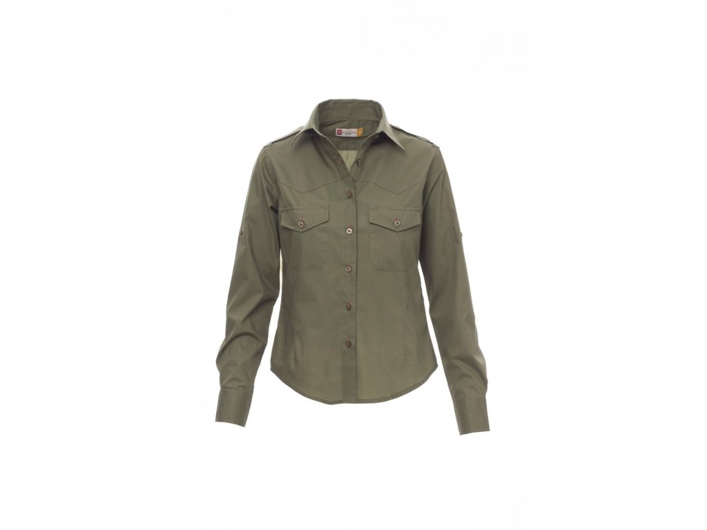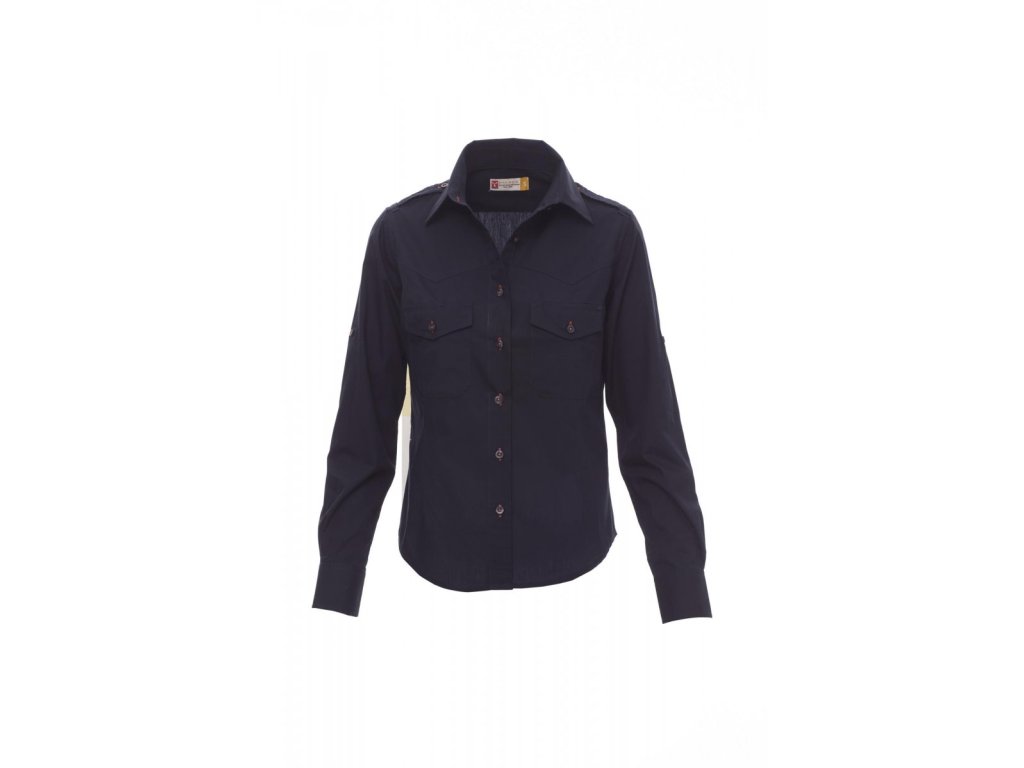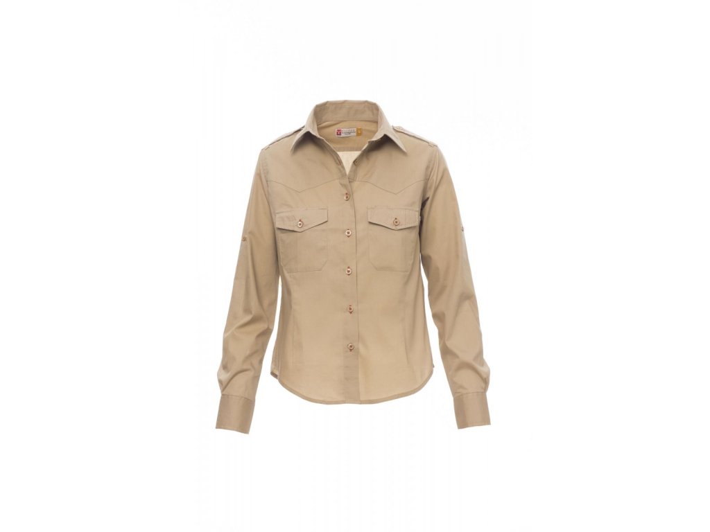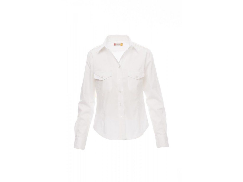 Dámská košile s krátkým rukávem z jemné česané bavlněné látky, mírně vyštíhlená, sedlo na přední části, zapínání na barevně sladěné knoflíky s kontrastními knoflíkovými dírkami, nárameníky, dvě kapsy na hrudi s klopou a očky na tužku, poutko s knoflíkem na rukávu pro praktické vyhrnování. Košile bílé barvy nemá knoflíkové dírky v kontrastní barvě a sedlo v přední části. Ošetření látky easy care.