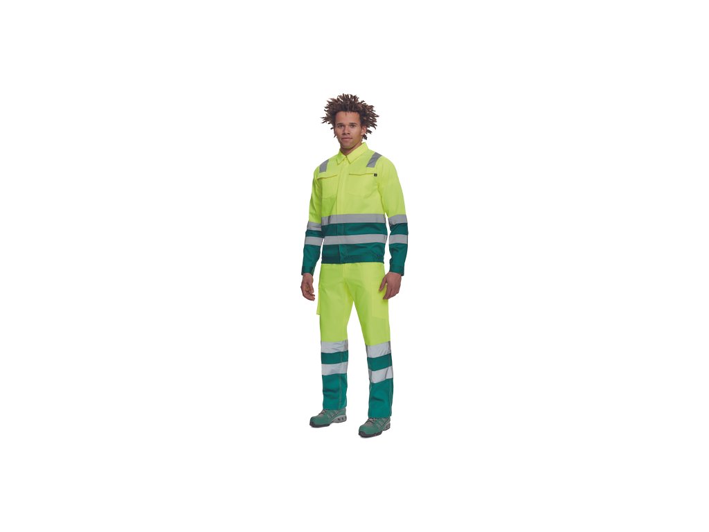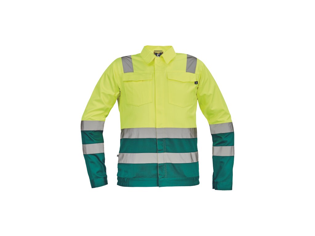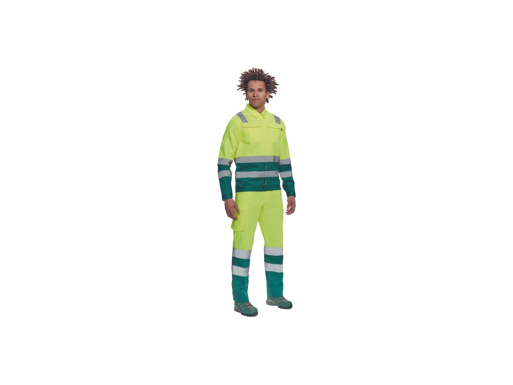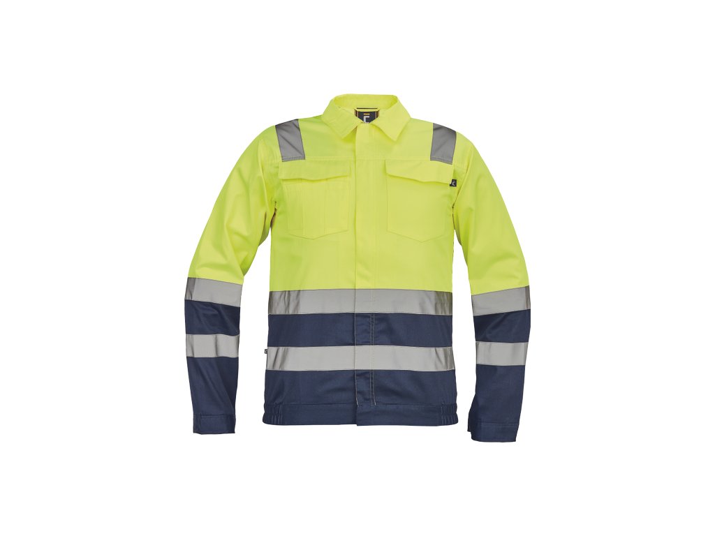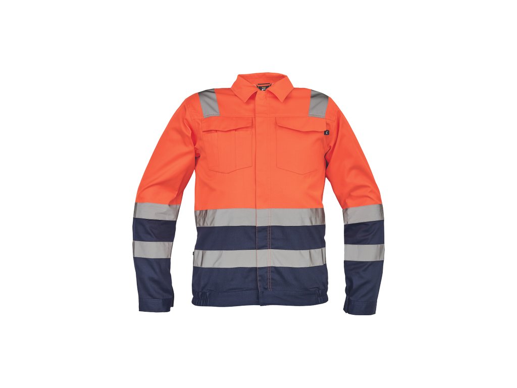 • pánská lehká HI-VIS pracovní bunda s reflexními pruhy přes ramena, v bocích a na rukávech • zapínání na zip kryté légou na suchý zip • 2 náprsní kapsy s klopou • elastický lem v bocích • nastavitelná šířka rukávů pomocí suchého zipu