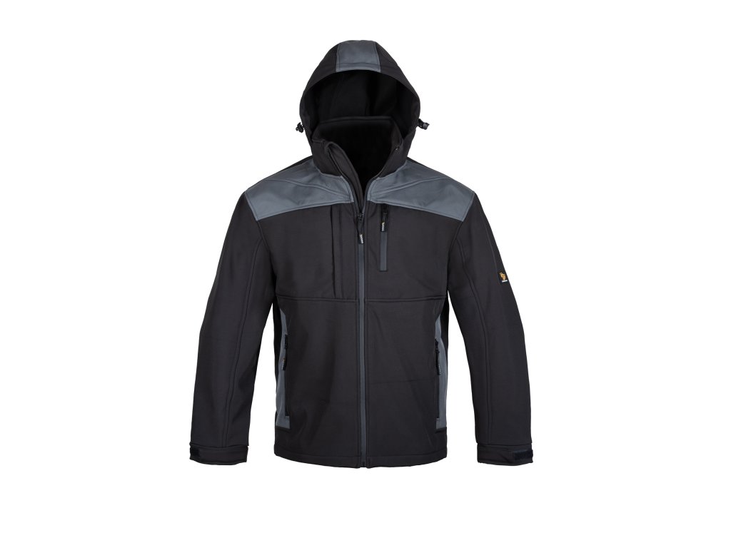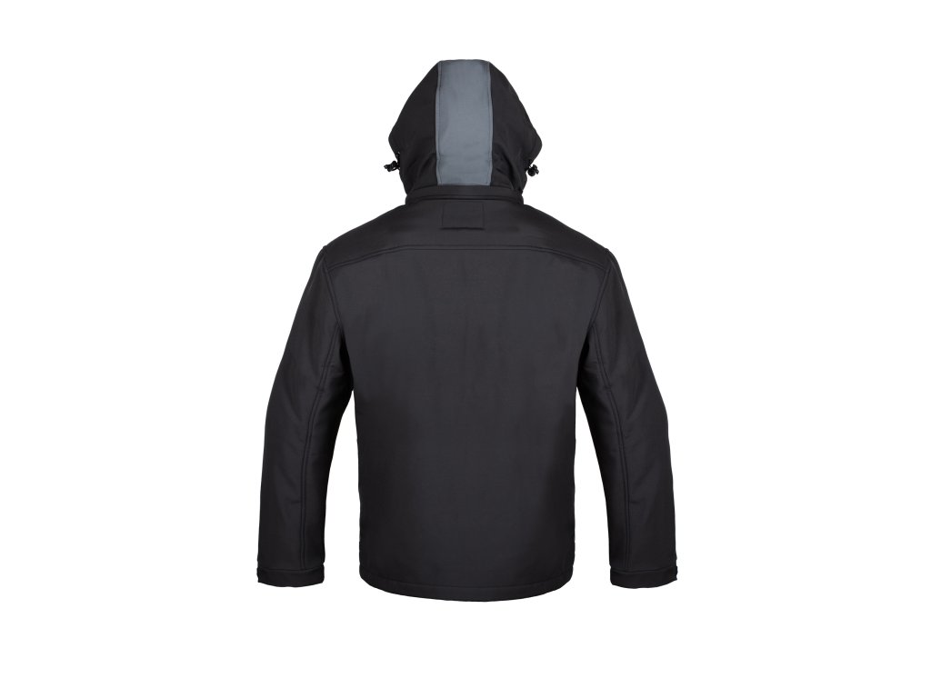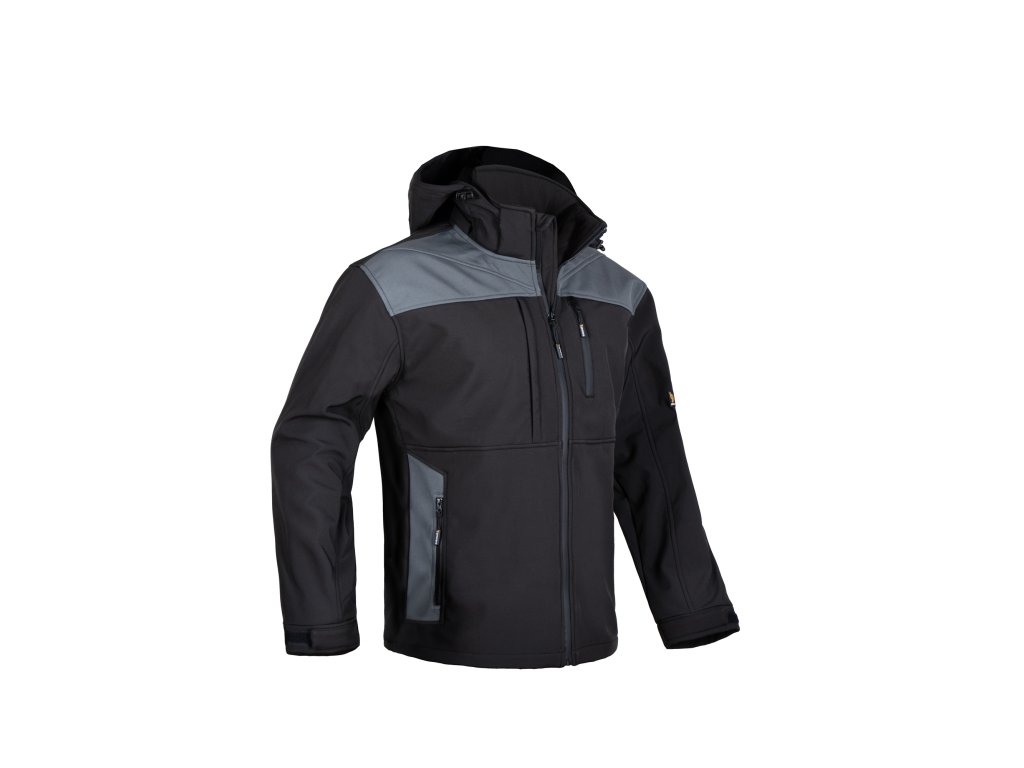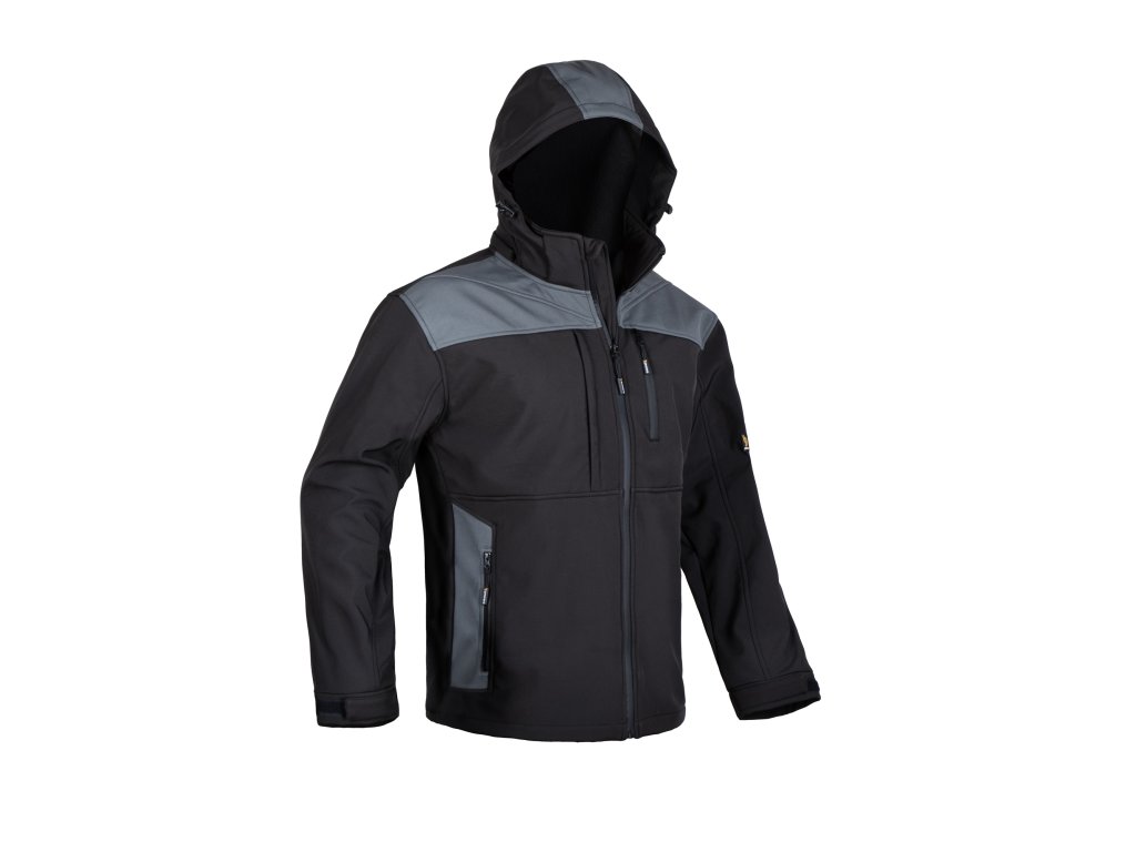 Černá softshellová bunda (100% polyester) s tmavě šedými vsadkami na ramenních popruzích, bočních kapsách a kapuci. Odnímatelná kapuce s nastavitelnou stahovací šňůrkou. Dvě náprsní kapsy na zip. Dvě boční kapsy na zip. Nastavitelné manžety se suchým zipem pro lepší padnutí. Tento výrobek splňuje požadavky normy PN-EN ISO 13688:2013