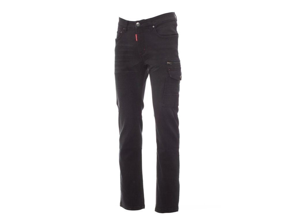 Pánské vícekapsové kalhoty džínového střihu, s pěti kapsami, zapínání na kovový zip a knoflík, poutka v pase, jedna velká postranní kapsa LOCK SYSTEM vevnitř vyztužená, 1 kapsa na zip, 1 kapsa na svinovací metr, 1 kapsa na smartphone, 1 kapsa na kladivo, 1 kapsička na tužky a cutter, ošetření stone washed, efekt obnošení a oprání, úzké nohavice, kontrastní odolné trojjehlové prošití na vnitřní straně nohavice. Hmotnost látky: 10,50oz/yd?.