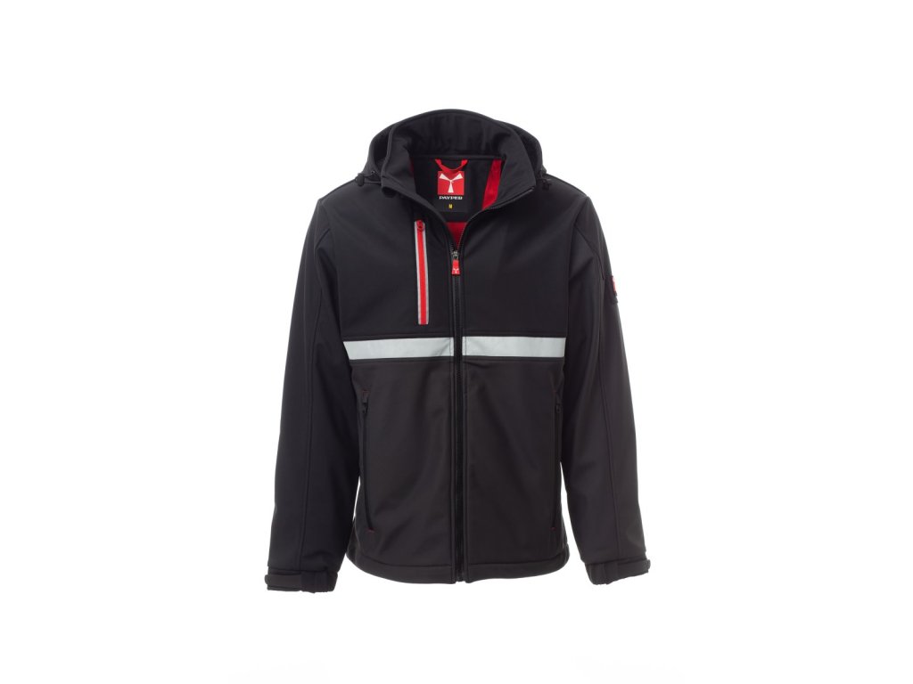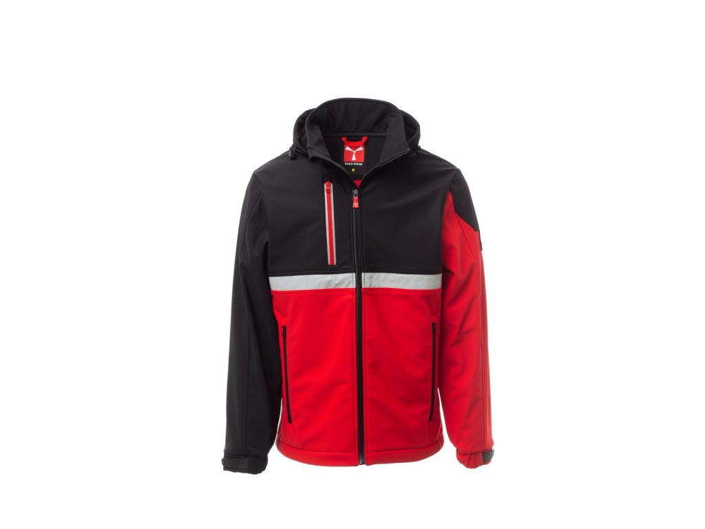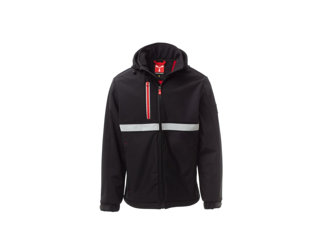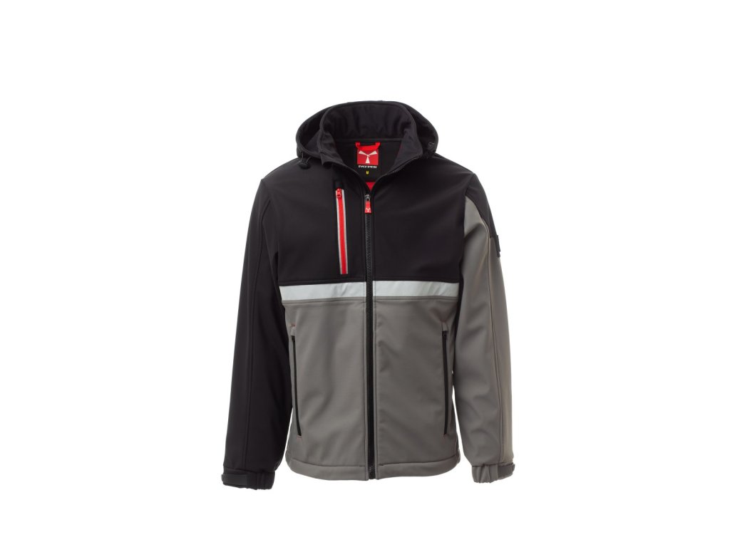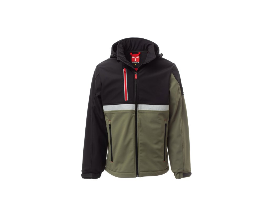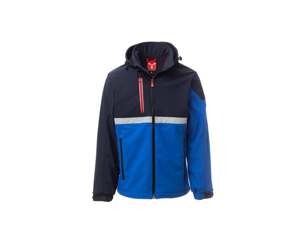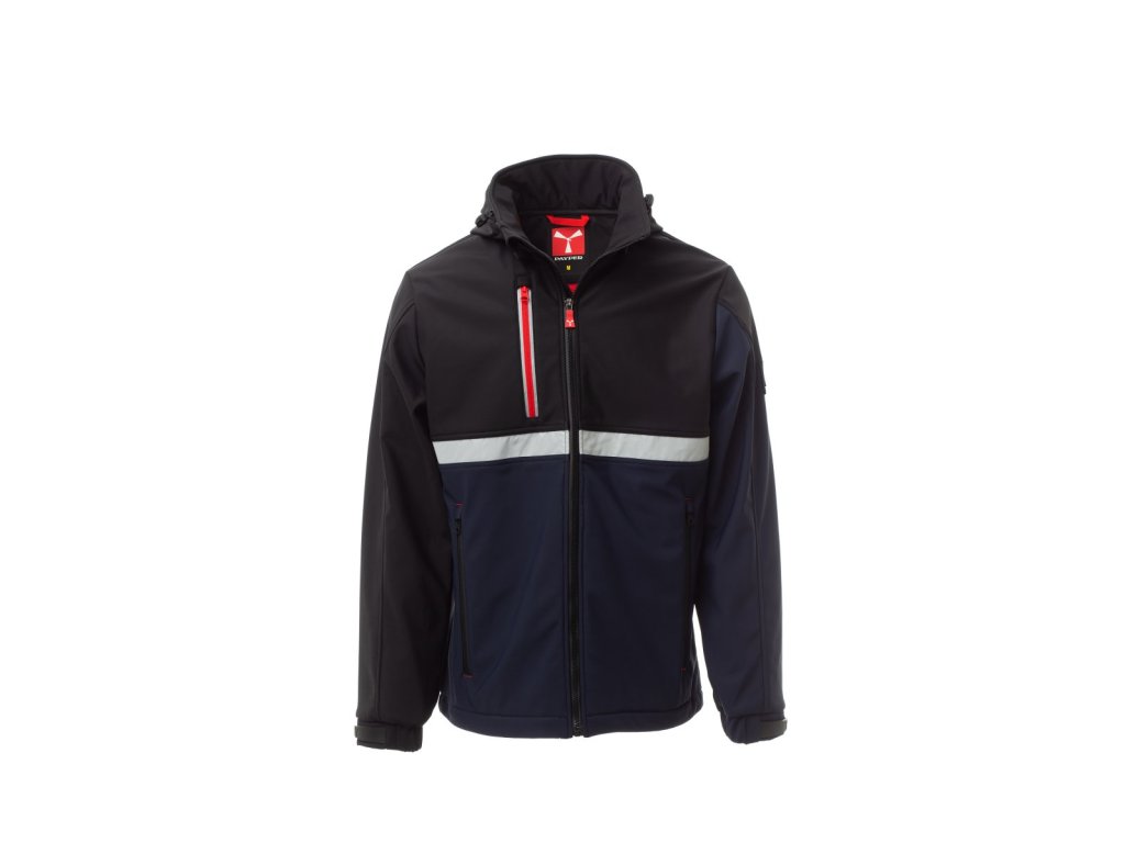 WP 8000 mm H₂O, WVT 5000 g/m² 24h. Pánský softshell 3 vrstvy, dvoubarevný, s límcem s flísovými vsadkami, zapínání na zip SBS s kovovým jezdcem „semi-auto lock“ a přizpůsobeným taháčkem. Odnímatelná kapuce se stahovací šňůrkou. Přední reflexní páska na hrudi. Elastické stahovací manžety na suchý zip. Dvě boční kapsy na zip a jedna kapsa na hrudi na zip s reflexním prvkem. Prvek „life-saving“ na zadní straně, s vnitřním reflexním logem a zapínáním na zip. Jedna vnitřní kapsa na tablet se zapínáním na suchý zip. Prodyšná vnitřní podšívka na zádech. Spodní část stažitelná pomocí přizpůsobených zarážek.