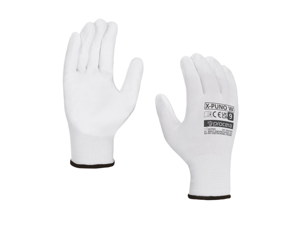Rukavice X-PUNO WHITE z odolného polyesteru, v úchopové části potažené polyuretanem. Flexibilní materiál zajišťuje pohodlí a volnost pohybu, zatímco odolný lem prodlužuje životnost. Ideální pro manuální práce vyžadující kvalitní úchop a citlivost v prstech. Rukavice patří do kategorie I.